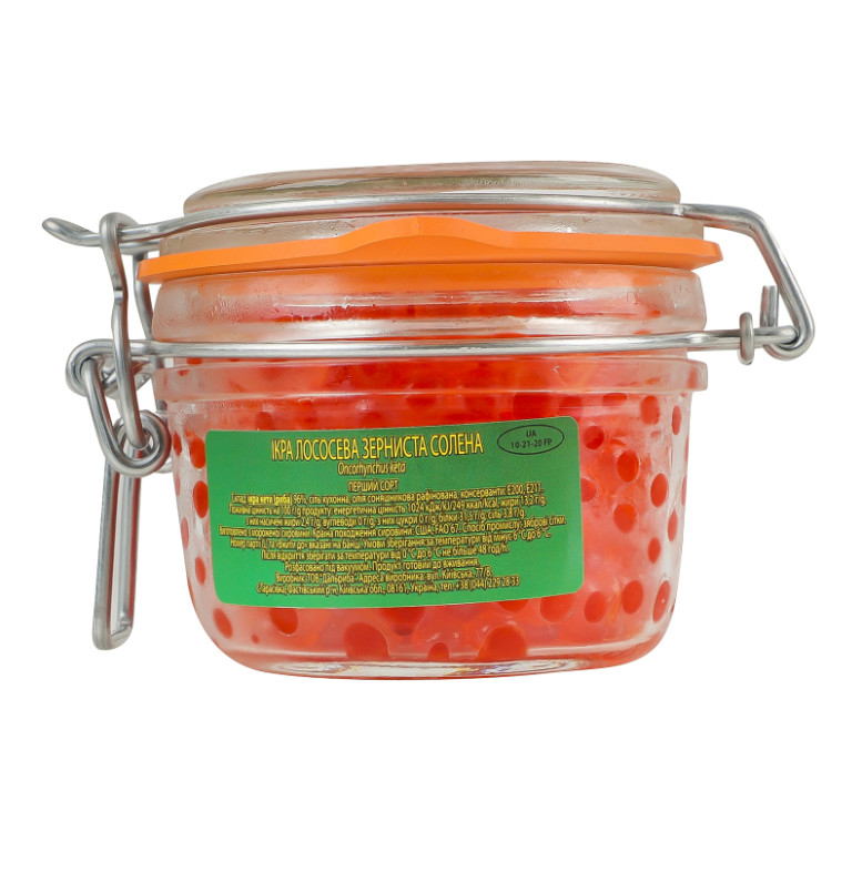 Склад: Ікра кети (риба) 96%, сіль кухонна, олія соняшникова рафінована, консерванти: Е200, Е211