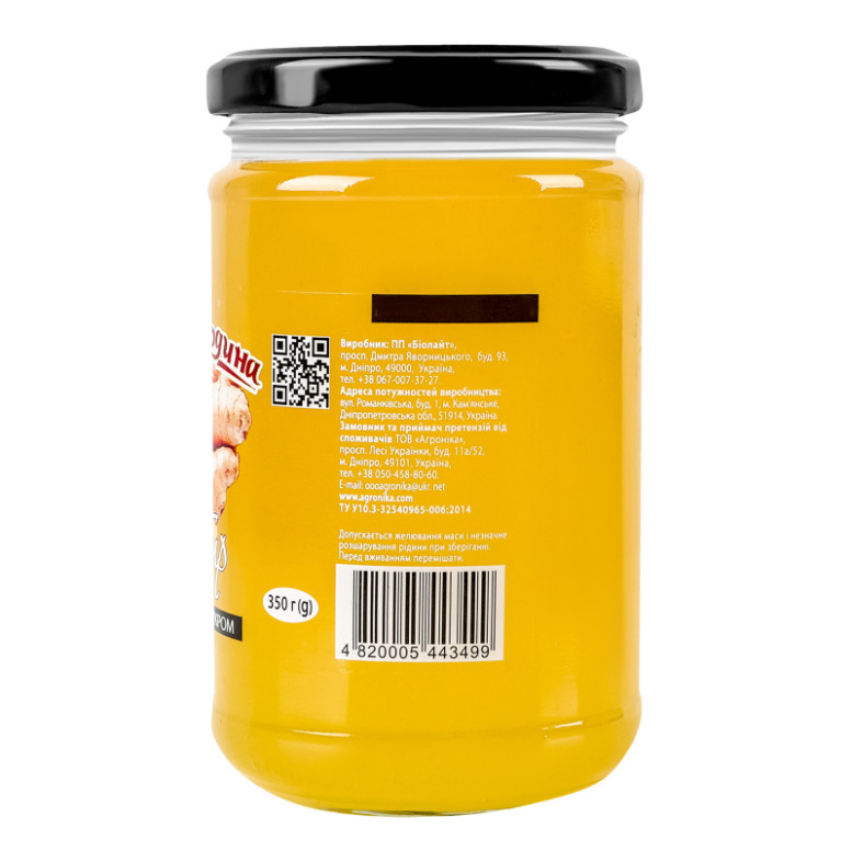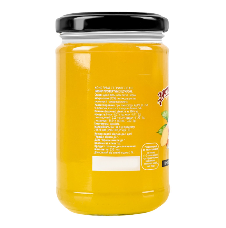 | Склад (укр.) | Цукор (60%), вода питна, корінь імбиру свіжий (15%), пектин, регулятор кислотності - лимонна кислота |