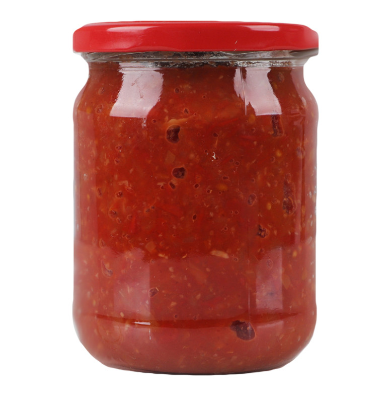 Склад: Томати червоні свіжі 47.9%, перець солодкий свіжий 37.7%, часник свіжий 4.6%, цукор білий кристалічний, сіль кухонна харчова, оцтова кислота, перець червоний мелений
