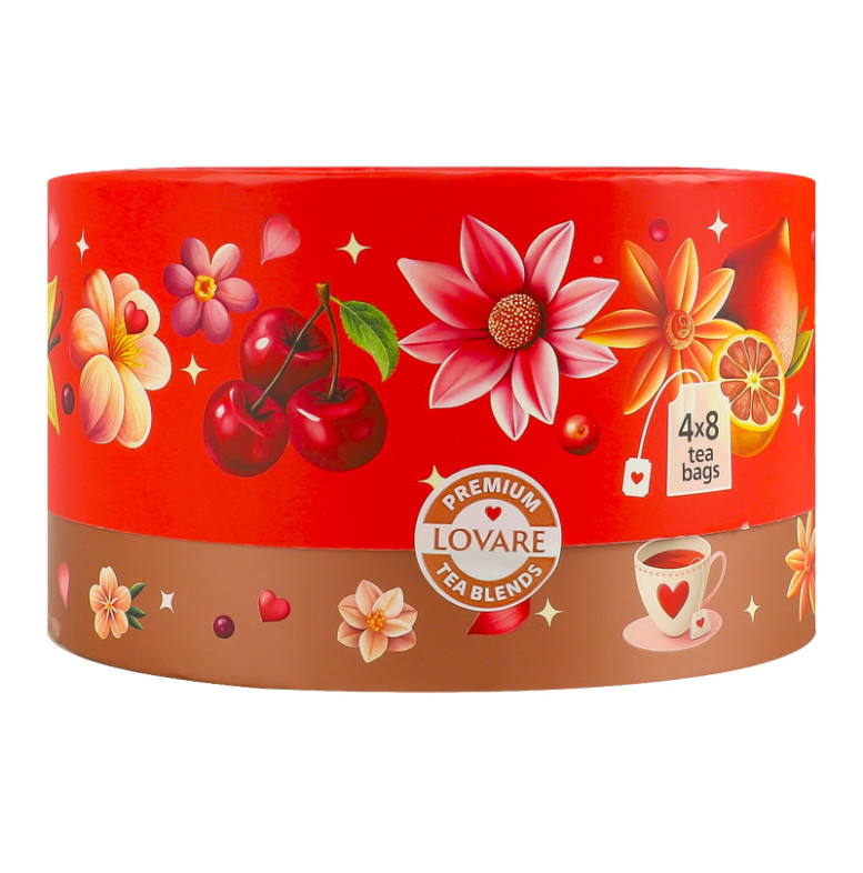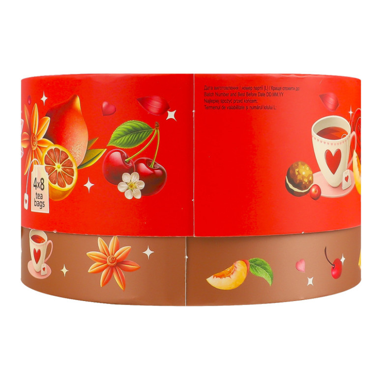 Склад: Чай чорний байховий Lemon Caramel Soufflé: чай чорний байховий дрібний, цедра лимона подрібнена (3.5%), квіти апельсина подрібнені (1%), натуральний ароматизатор "Лимон", натуральний ароматизатор "Карамель". Чай чорний байховий Black Forest Torte: чай чорний байховий дрібний, ягоди вишні подрібнені (2%), лапачо (2%), натуральні ароматизатори "Вишня", "Трюфель". Чай чорний байховий дрібний Velvet Apple Strudel: чай чорний байховий дрібний, яблуко подрібнене (2%), лапачо та кориця подрібнені (1%), пелюстки сафлору, натуральні ароматизатори "Карамель", "Яблуко", "Ваніль". Чай чорний байховий дрібний Peach Creamy Biscuit: чай чорний байховий дрібний, подрібнені какао-боби (1%), подрібнена кориця (1%), натуральний ароматизатор "Персик", натуральний ароматизатор "Бісквіт", пелюстки квітів персика