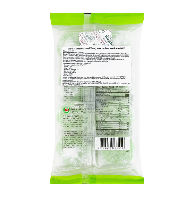 Склад: Мальтоза, гідроксипропілдикрохмальфосфат (Е1442), цукор, ацетильований дикрохмальфосфат (Е1414), глюкоза, вода, желатин, крохмаль тапіоковий, картопляний порошок, ароматизатор дині Хамі, консервант (сорбат калію, Е202), емульгатор (гліцериди жирних кислот, Е471), ксантанова камедь (Е415), барвники: блакитний блискучий FCF (Е133), тартразин (Е102)