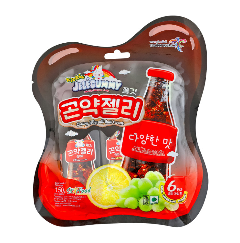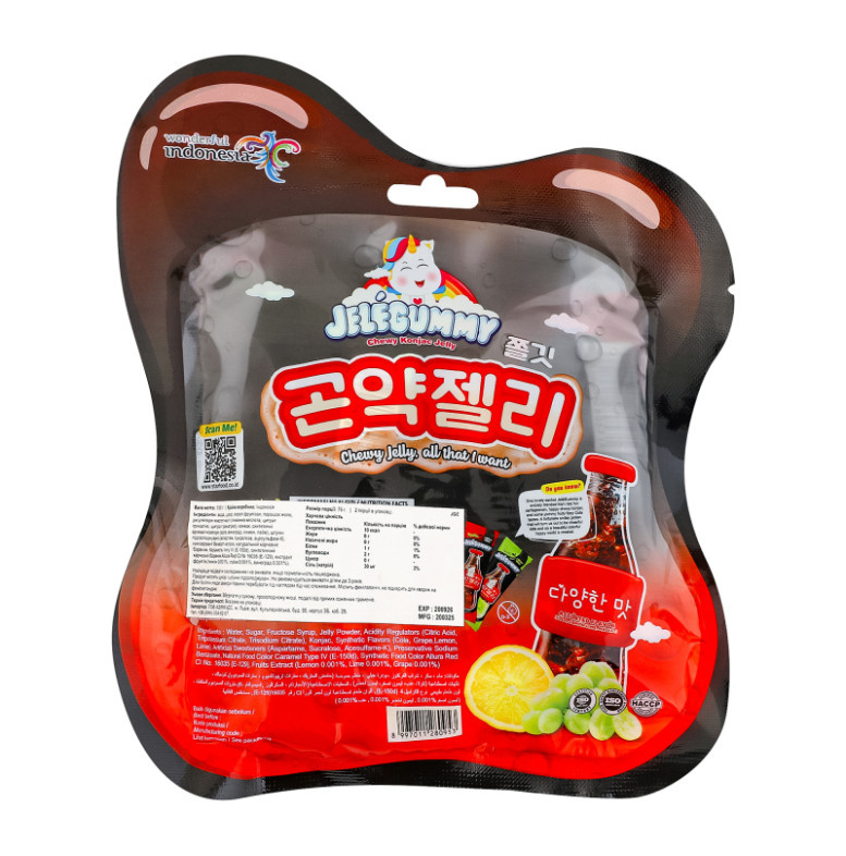 Склад: Вода, цукор, сироп фруктози, порошок желе, регулятори кислотності (лимонна кислота, цитрат трикалію, цитрат тринатрію), конжак, синтетичні ароматизатори (кола, виноград, лимон, лайм), штучні підсолоджувачі (аспартам, сукралоза, ацесульфам-К), консервант бензоат натрію, натуральний харчовий барвник карамель типу IV (E150d), синтетичний харчовий барвник Allur Red CI №16035 (Е129), екстракт фруктів (лимон 0.001%, лайм 0.001%, виноград 0.001%)