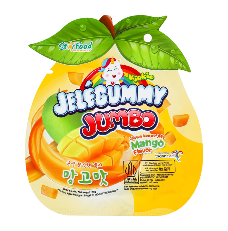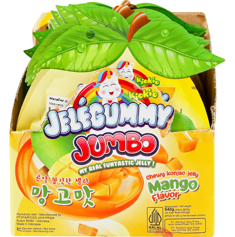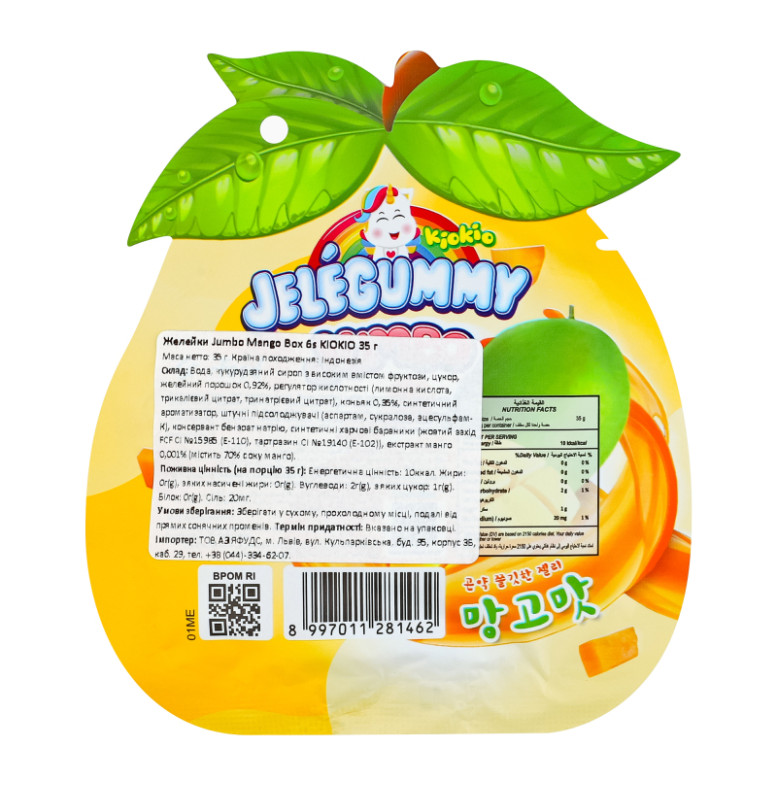 Склад: Вода, кукурудзяний сироп з високим вмістом фруктози, цукор, желейний порошок 0.92%, регулятор кислотності (лимонна кислота, трикалієвий цитрат, тринатрієвий цитрат), конжак 0.35%, синтетичний ароматизатор, штучні підсолоджувачі (аспартам, сукралоза, ацесульфам-К), консервант бензоат натрію, синтетичні харчові барвники (жовтий захід FCF CI №15985 (Е110), тартразин СI №19140 (Е102)), екстракт манго 0.001% (містить 70% соку манго)