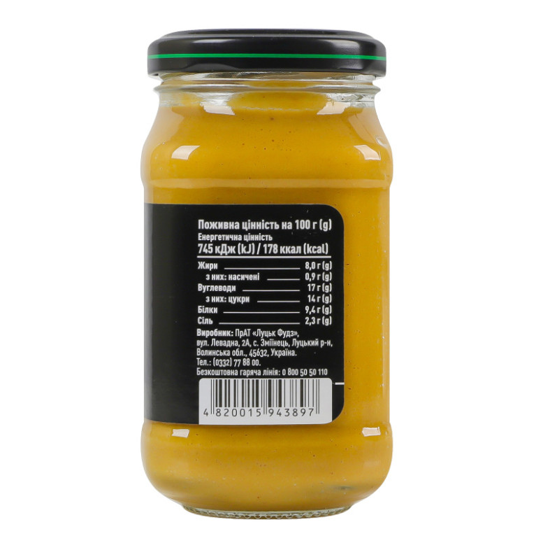 | Склад (укр.) | Вода питна, порошок гірчичний (25.3%), цукор, олія соняшникова, сіль кухонна, регулятор кислотності - оцтова кислота, стабілізатор - ксантанова камедь, куркума мелена, екстракти прянощів |