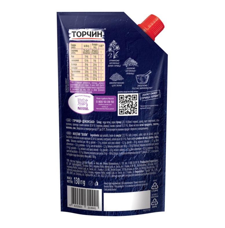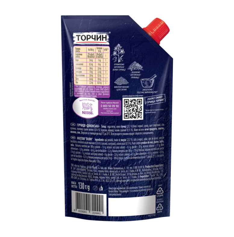| Склад (укр.) | Вода питна, зерно гірчиці (25.5%) (білої і чорної), цукор, оцет спиртовий, сіль кухонна, прянощі сушені мелені (0.16%) (куркума, кориця), часник сушений (0.15%) |