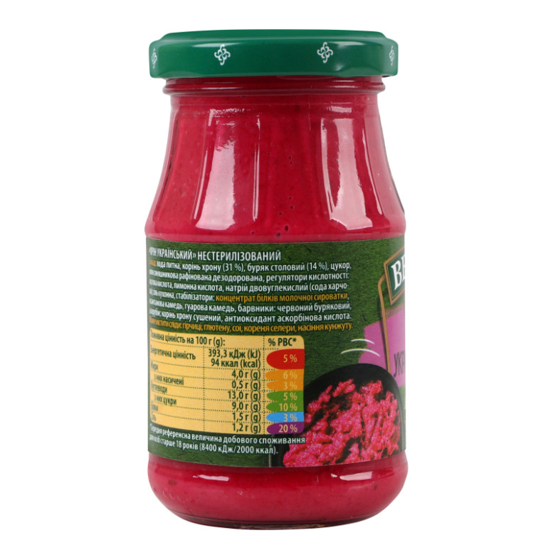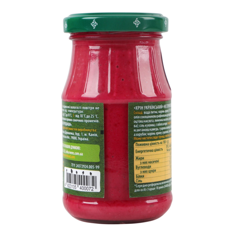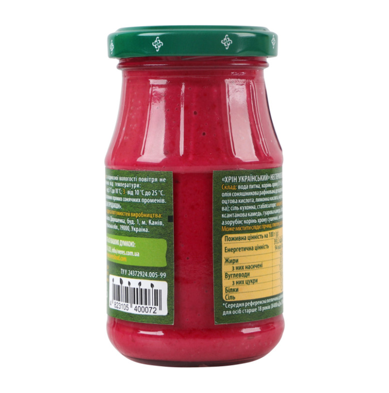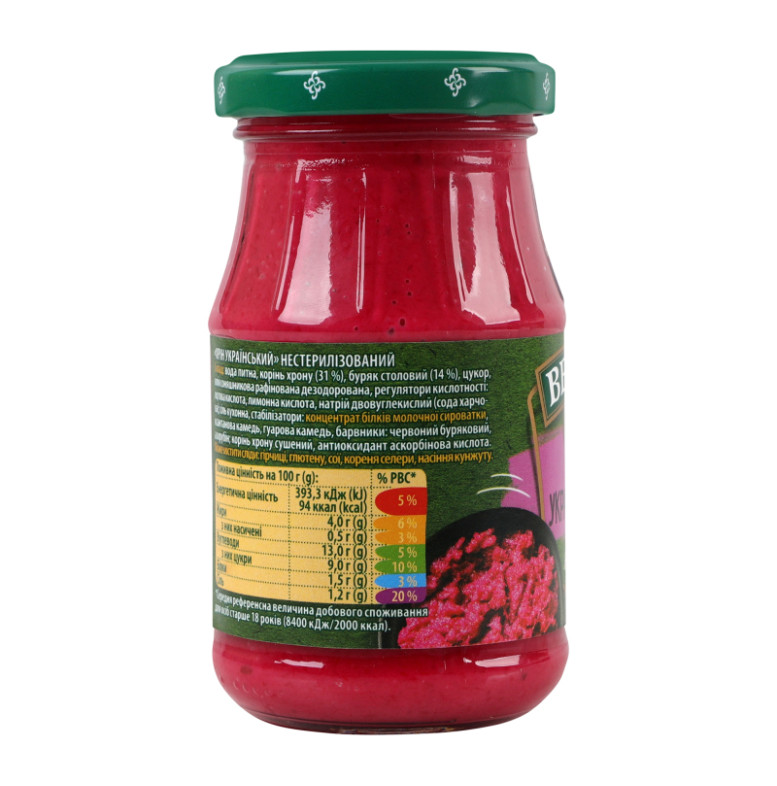 | Склад (укр.) | Вода питна, корінь хрону (31%), буряк столовий (14%), цукор, олія соняшникова рафінована дезодорована, регулятори кислотності: оцтова кислота, лимонна кислота, натрій двовуглекислий (сода харчова), сіль кухонна, стабілізатори: концентрат білків молочної сироватки, ксантанова камедь, гуарова камедь, барвники: червоний буряковий, азорубін, корінь хрону сушений, антиоксидант аскорбінова кислота |
