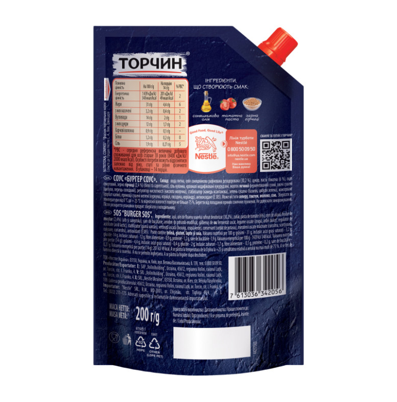 | Склад (укр.) | Вода питна, олія соняшникова рафінована дезодорована (30.2%), цукор, паста томатна (6%), зерно гірчиці (2.4%) (білої та сарептської), оцет спиртовий, сіль кухонна, крохмалі модифіковані кукурудзяні, жовток яєчний ферментований сухий, овочі сушені (цибуля, перець червоний солодкий, часник), регулятори кислотності (кислота оцтова, кислота молочна), стабілізатор (камедь ксантанова), зелень сушена (базилік, цибуля), консервант (сорбат калію), спеції сушені мелені (куркума, кориця, гвоздика, коріандр, перець червоний гіркий), антиоксидант (Е385) |