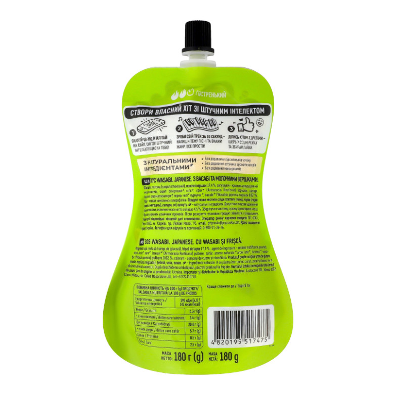 Склад: Вода, платока (сироп глюкозний), молочні вершки 17.4%, загущувач - крохмаль кукурудзяний модифікований, оцет спиртовий, сіль, хрін (Armoracia Rusticana) порошок, цукор, натуральні ароматизатори, перець чилі, куркума, васабі (Wasabia japonica) порошок 0.02 %, барвники - мідні комплекси хлорофілінів