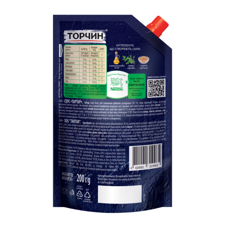 | Склад (укр.) | Вода питна, олія соняшникова рафінована дезодорована (30.1%), огірки мариновані (огірки, регулятор кислотності (кислота оцтова), сіль кухонна), цукор, крохмалі модифіковані кукурудзяні, оцет спиртовий, овочі сушені (цибуля, часник), зерно пшениці (1.2%) (білої та сарептської), сіль кухонна, жовток яєчний ферментований сухий, трави пряні сушені (0.3%) (розмарин, петрушка), регулятор кислотності (кислота молочна), консервант (сорбат калію), стабілізатор (камедь ксантанова), екстракт кропу, антиоксидант (Е385) |