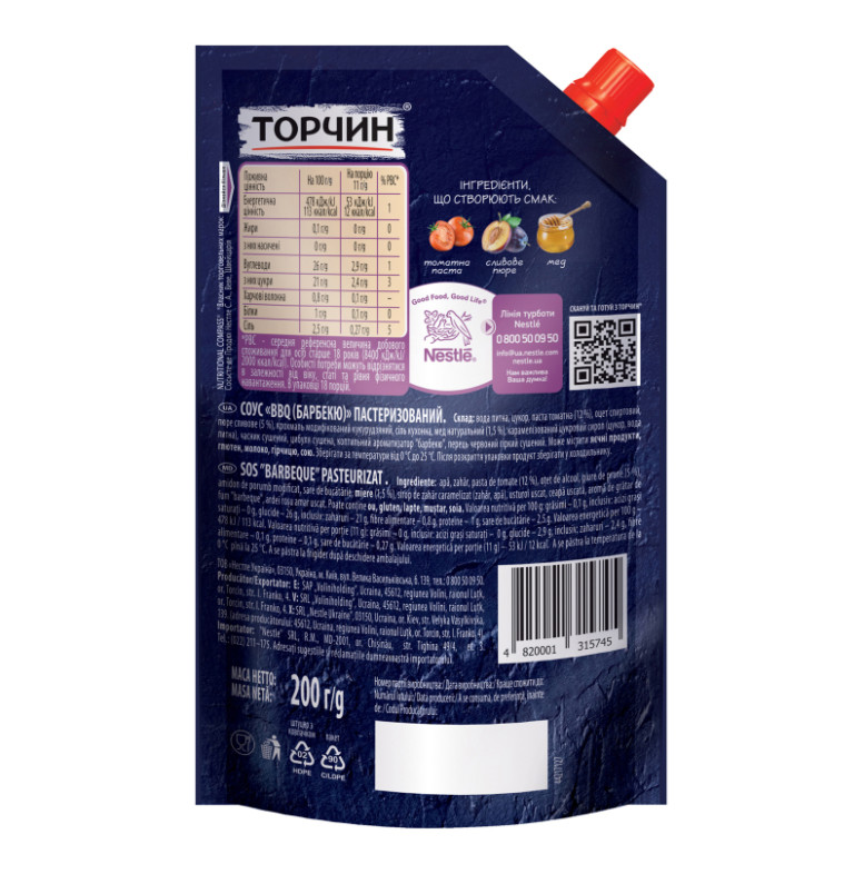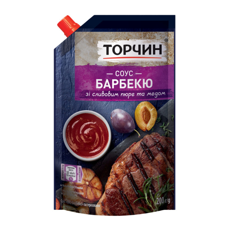 Склад: Вода питна, цукор, паста томатна (12%), оцет спиртовий, пюре сливове (5%), крохмаль модифікований кукурудзяний, сіль кухонна, мед натуральний (1.5%), карамелізований цукровий сироп (цукор, вода питна), часник сушений, цибуля сушена, коптильний ароматизатор "барбекю", перець червоний гіркий сушений