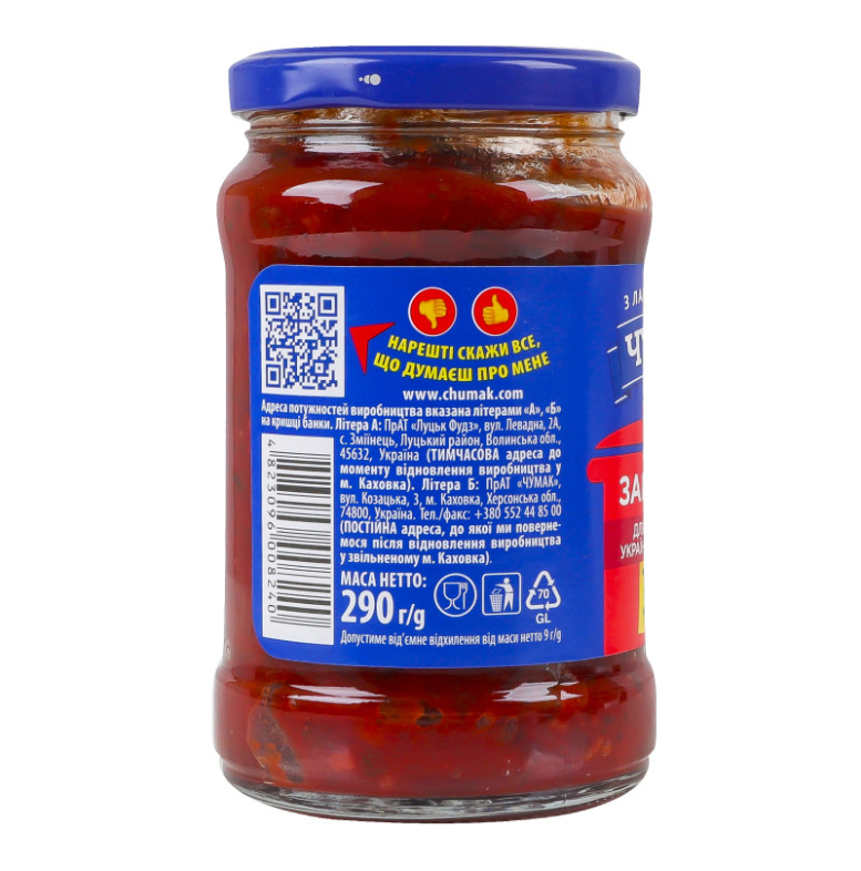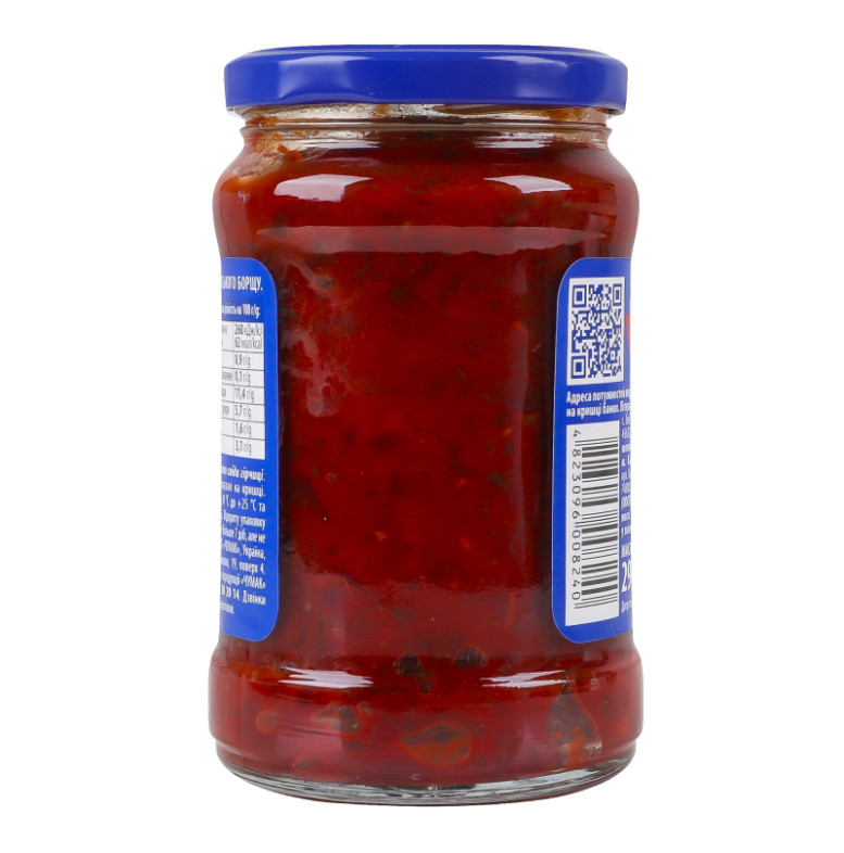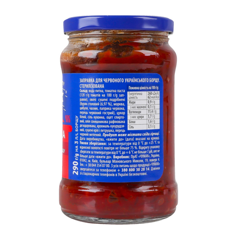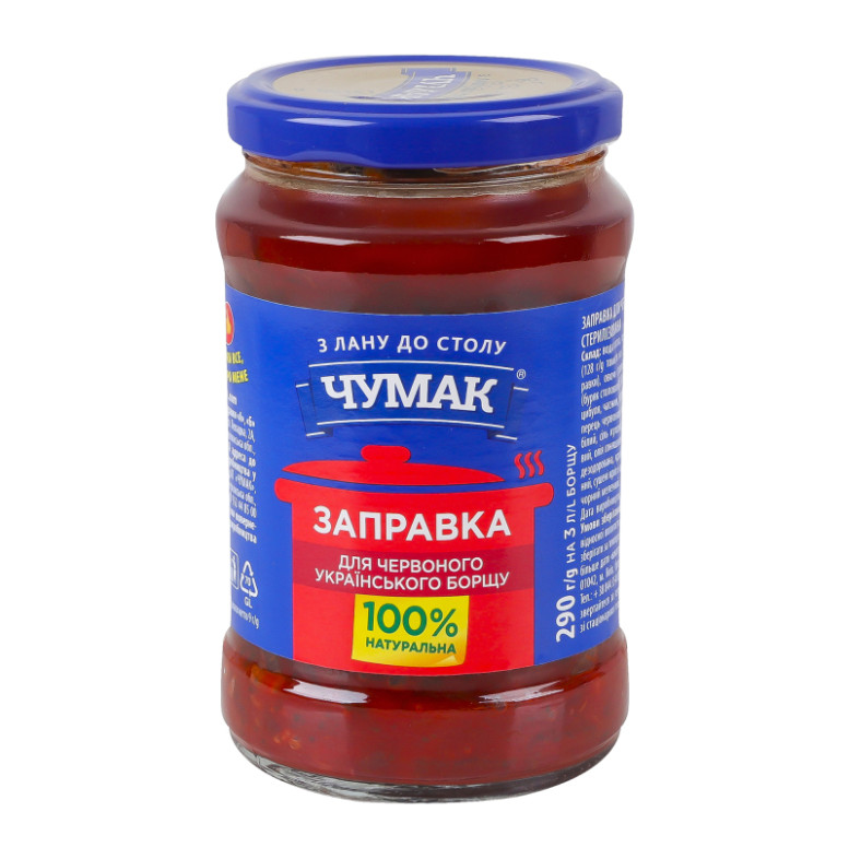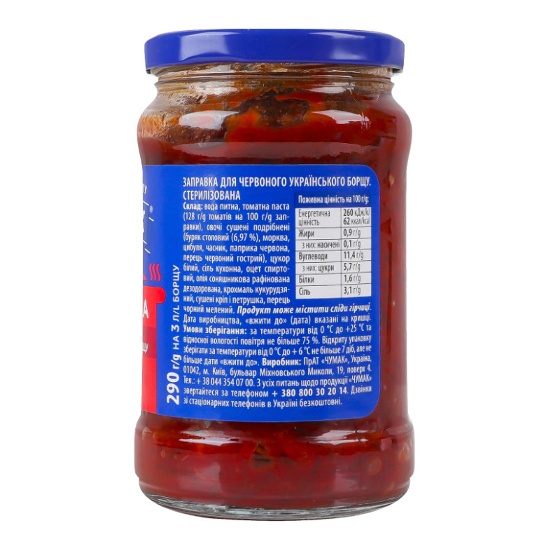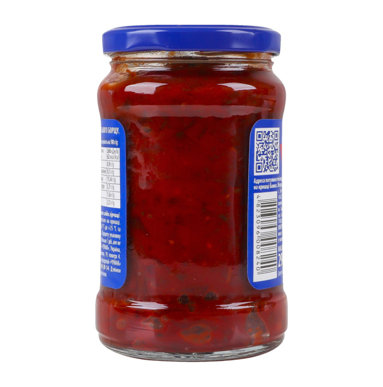 Склад: Вода питна, томатна паста (128г томатів на 100г заправки), овочi сушені подрібнені (буряк столовий (6.97%), морква, цибуля, часник, паприка червона, перець червоний гострий), цукор білий, сіль кухонна, оцет спиртовий, олія соняшникова рафінована дезодорована, сушені кріп і петрушка, перець чорний мелений