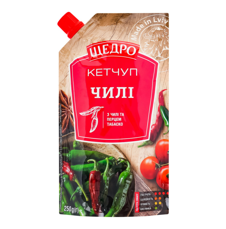 | Склад (укр.) | Вода питна, паста томатна 23%, цукор, загущувач крохмаль модифікований кукурудзяний, сіль кухонна, регулятор кислотності кислота оцтова, перець чорний, екстракт перцю чилі 0.15%, екстракт перцю табаско 0.1%, консервант сорбат калію, кумин, перець гострий (чилі) сушений 0.001% |