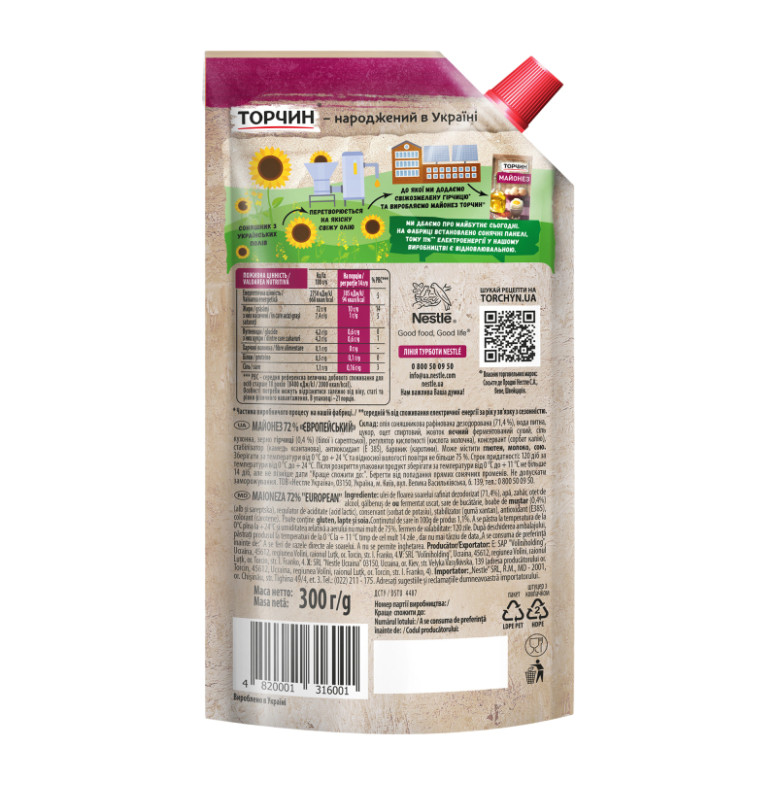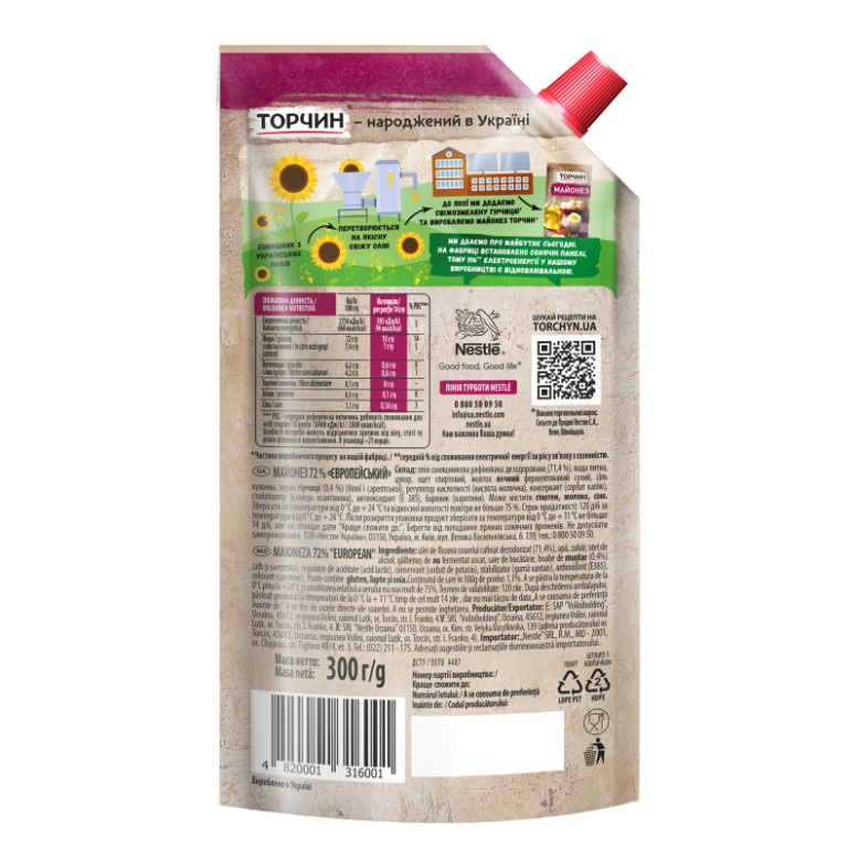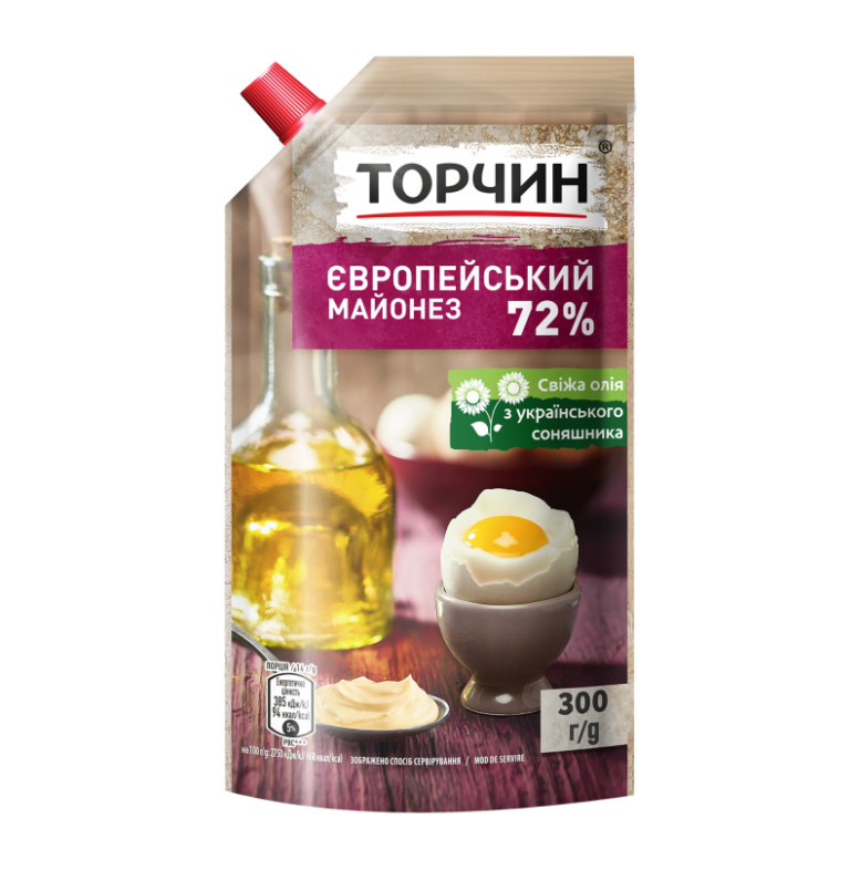 Склад (укр.)Олія соняшникова рафінована дезодорована (71.4%), вода питна, цукор, оцет спиртовий, жовток яєчний ферментований сухий, сіль кухонна, зерно гірчиці (0.4%) (білої та сарептської), регулятор кислотності (кислота молочна), консервант (сорбат калію), стабілізатор (камедь ксантанова), антиоксидант (Е385), барвник (каротини)