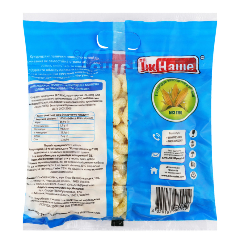 | Склад (укр.) | Крупа кукурудзяна (47.51%), пудра цукрова (21.38%), олія соняшникова рафінована дезодорована (11.87%), молоко сухе незбиране (19%), вода, сіль поварена харчова (0.16%), ароматизатор - ванілін (0.047%) |
