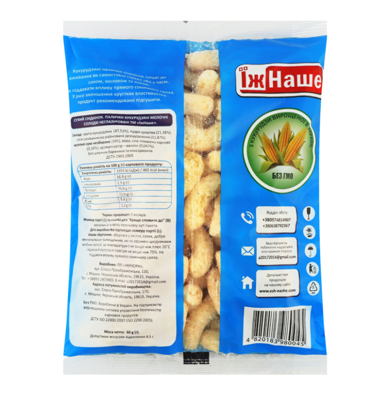 | Склад (укр.) | Крупа кукурудзяна (47.51%), пудра цукрова (21.38%), олія соняшникова рафінована дезодорована (11.87%), молоко сухе незбиране (19%), вода, сіль поварена харчова (0.16%), ароматизатор - ванілін (0.047%) |
