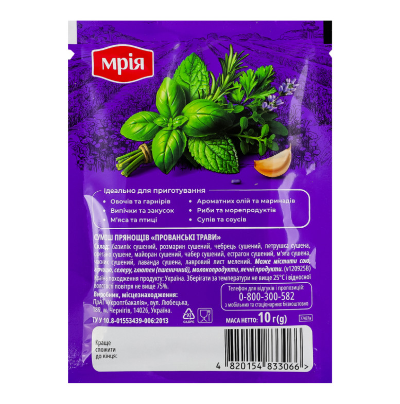 | Склад (укр.) | Базилік сушений, розмарин сушений, чебрець сушений, петрушка сушена, орегано сушене, майоран сушений, чабер сушений, естрагон сушений, м'ята сушена, часник сушений, лаванда сушена, лавровий лист мелений |