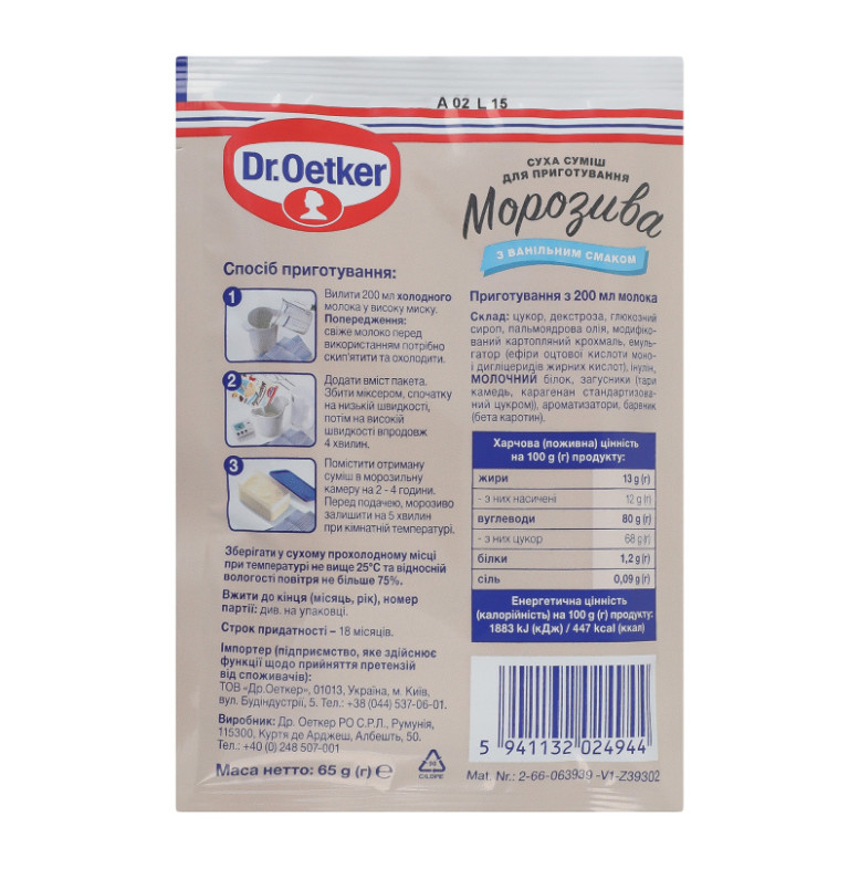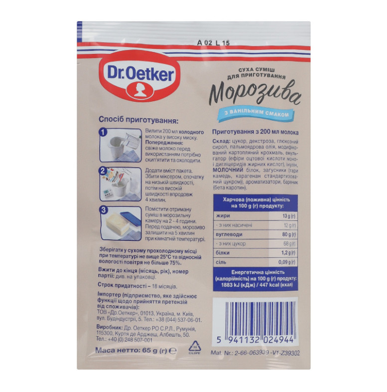 Суміш суха для приготування морозива з ванільним смаком Dr.Oetker м/у 65г