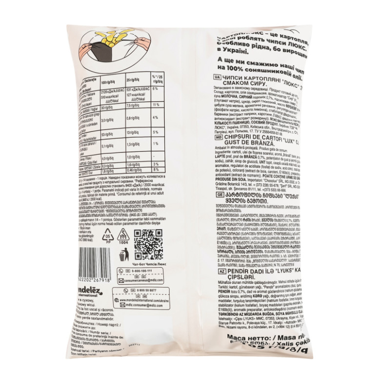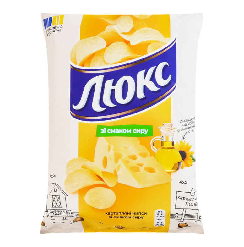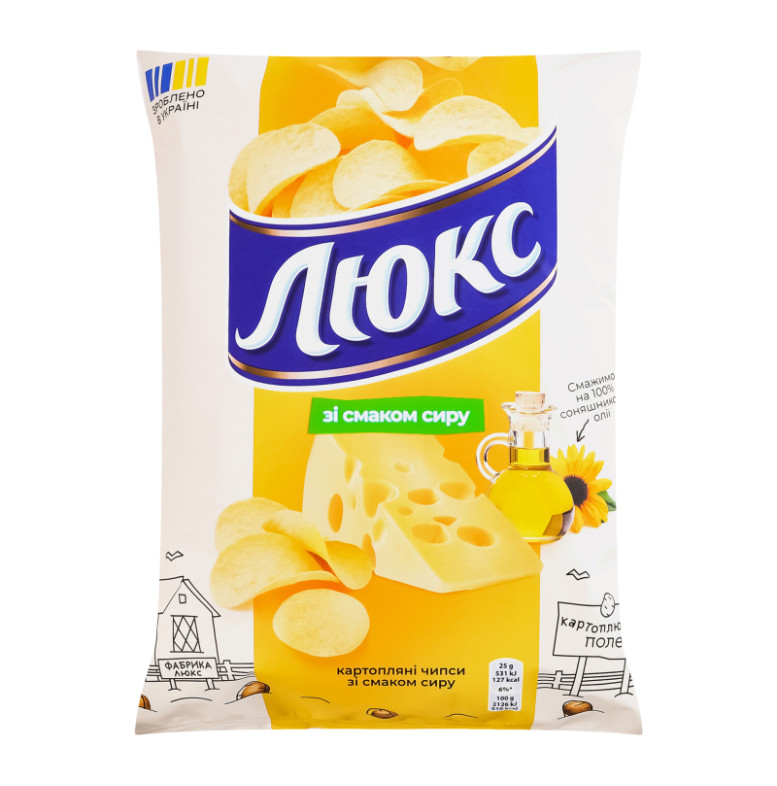 Склад: Картопля, олія соняшникова, ароматизатор "Сир" (сіль, сироватка суха молочна, сирний порошок 0.7%, підсилювач смаку та аромату (глутамат натрію), цукор, сироп глюкозний, масло вершкове топлене, цибуля суха мелена, ароматичні речовини, регулятори кислотності (фосфати натрію, кислота лимонна), стабілізатор (фосфати калію), барвники (екстракт паприки, каротини, Е160b(ii)), ароматичні препарати, антиоксидант (екстракт розмарину))