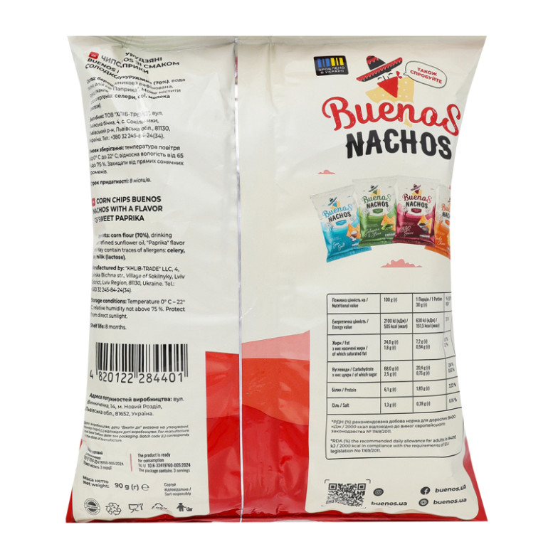 | Склад (укр.) | Борошно кукурудзяне (70%), вода питна, олія соняшникова рафінована, суміш смакова "Паприка" |