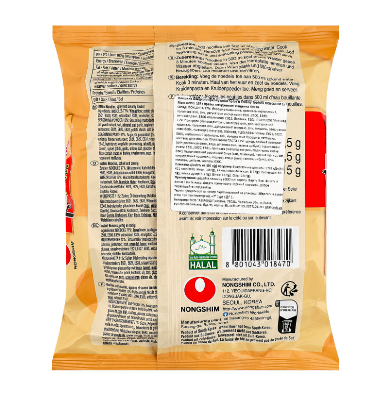 Склад: Локшина 77%: борошно пшеничне, крохмаль картопляний, пальмова олія, сіль, регулятори кислотності: Е501, Е500, Е339, антиоксидант: Е306, емульгатор: Е322, барвник. E101. Порошок приправ 12%: приправи (мальтодекстрин, кокосова олія, рис, картопляний крохмаль, пальмова олія, дріжджовий екстракт, сіль, мигдаль, овес, часник, соєві боби, пшениця), мальтоза, глюкоза, підсилювачі смаку: Е621, E627, Е631, картопляний крохмаль, сіль, кукурудзяне борошно, петрушка, шиїтаке, ріпакова олія. Приправна паста 11%: цукор, олійний препарат (олія рисових висівок, вода, ріпакова олія, зелена цибуля), підсилювачі смаку: Е621, Е627, Е631, приправа (мальтодекстрин, підсилювач смаку, E640, гідролізований рослинний білок (соя, пшениця), насіння гірчиці, соя кукурудзяний крохмаль, морква), спеції (чилі, часник, цибуля), сіль, глюкоза, шиїтаке, кислота: Е330