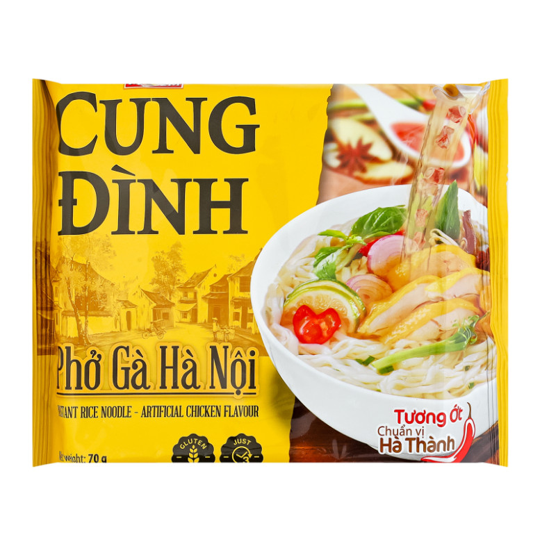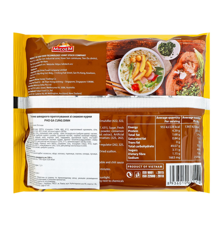 Склад: Локшина (70%): рис (83%), згущувач (E1404, E466, E412), картопляний крохмаль, сіль, емульгатори (E422, E322, E451) (соя), антиоксидант (E307b). Соус (25%): вода, сіль, пальмова олія, цукор, свіжі інгредієнти (цибуля шалот, часник, лемонграс), спеції (цибуля шалот сушена, сушений часник, чорний мелений перець, імбир, порошок перцю чилі, кориця, аніс, кардамон, мускатний горіх), екстракт дріжджів, штучні ароматизатори (аромат курки, аромат базиліка), підсилювач смаку (E621), згущувач (E415), регулятор кислотності (E270, E211), антиоксидант (E307b) (соя). Чилі соус (3%): вода, перець чилі (40%), гліцерин, сіль, згущувач (E1422, E415), оцет, підсилювач смаку (E621), консерванти (E262, E325), регулятор кислотності (E330). Овочі (2%): м'ясо соєве, цибуля сушена