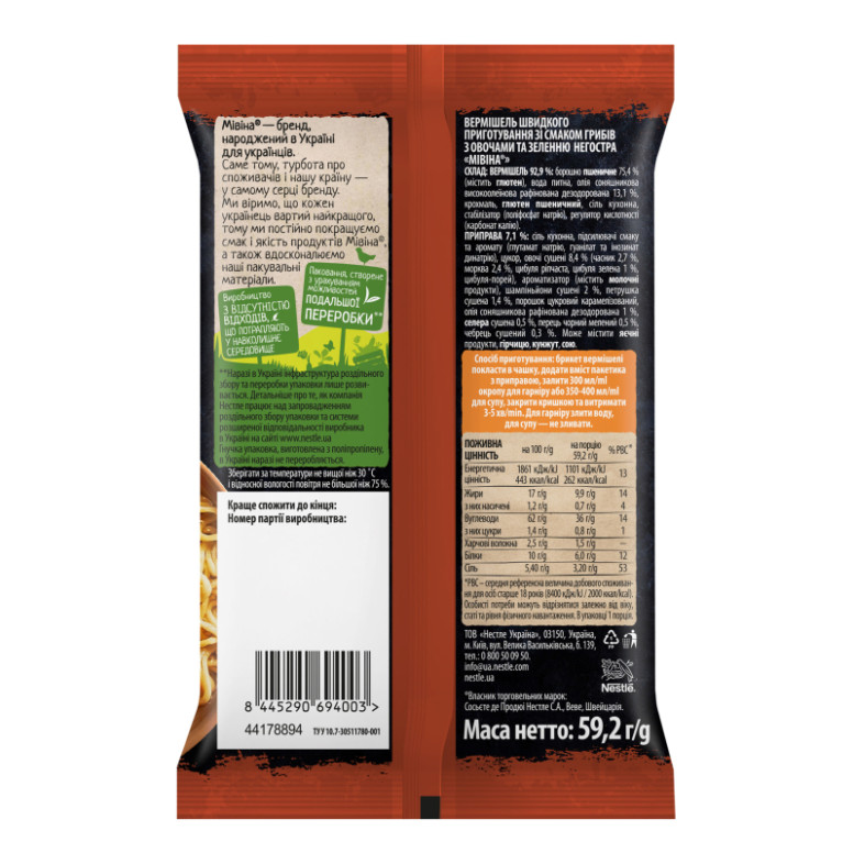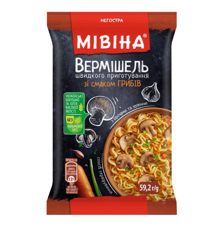 | Склад (укр.) | Вермішель 92.9%: борошно пшеничне 75.4% (містить глютен), вода питна, олія соняшникова високоолеїнова рафінована дезодорована 13.1%, крохмаль, глютен пшеничний, сіль кухонна, стабілізатор (поліфосфат натрію), регулятор кислотності (карбонат калію), приправа 7.1%: сіль кухонна, підсилювачі смаку та аромату (глутамат натрію, гуанілат та інозинат динатрію), цукор, овочі сушені 8.4% (часник 2.7%, морква 2.4%, цибуля ріпчаста, цибуля зелена 1%, цибуля-порей), ароматизатор (містить молочні продукти), шампіньйони сушені 2%, петрушка сушена 1.4%, порошок цукровий карамелізований, олія соняшникова рафінована дезодорована 1%, селера сушена 0.5%, перець чорний мелений 0.5%, чебрець сушений 0.3% |