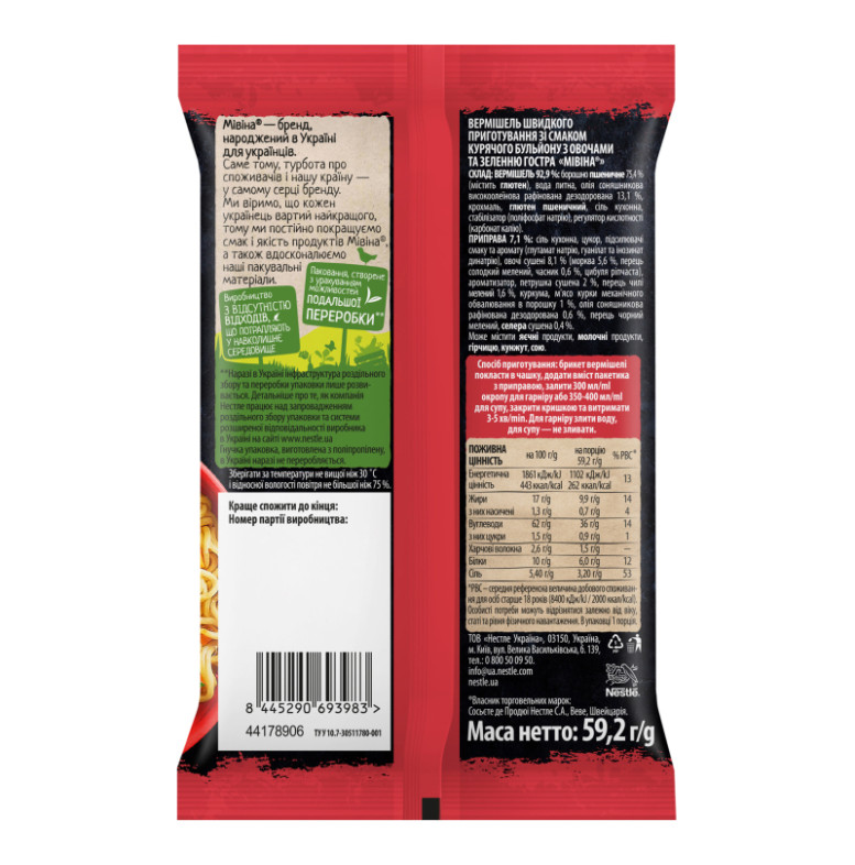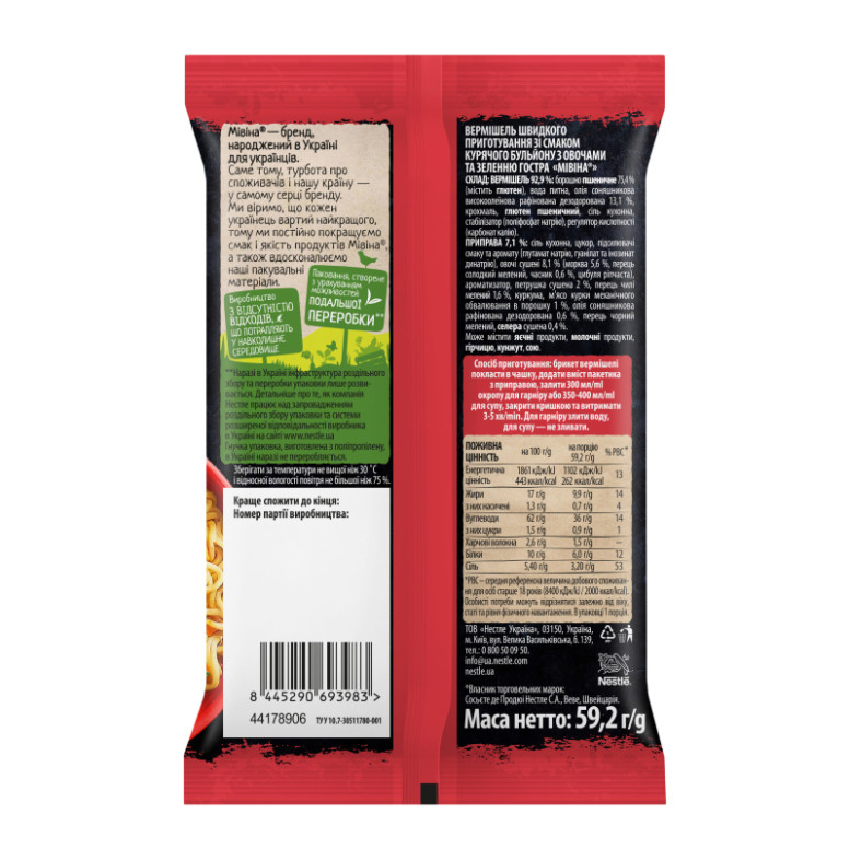 | Склад (укр.) | Вермішель 92.9%: борошно пшеничне 75.4% (містить глютен), вода питна, олія соняшникова високоолеїнова рафінована дезодорована 13.1%, крохмаль, глютен пшеничний, сіль кухонна, стабілізатор (поліфосфат натрію), регулятор кислотності (карбонат калію), приправа 7.1%: сіль кухонна, цукор, підсилювачі смаку та аромату (глутамат натрію, гуанілат та інозинат динатрію), овочі сушені 8.1% (морква 5.6%, перець солодкий мелений, часник 0.6%, цибуля ріпчаста), ароматизатор, петрушка сушена 2%, перець чилі мелений 1.6%, куркума, м'ясо курки механічного обвалювання в порошку 1%, олія соняшникова рафінована дезодорована 0.6%, перець чорний мелений, селера сушена 0.4% |