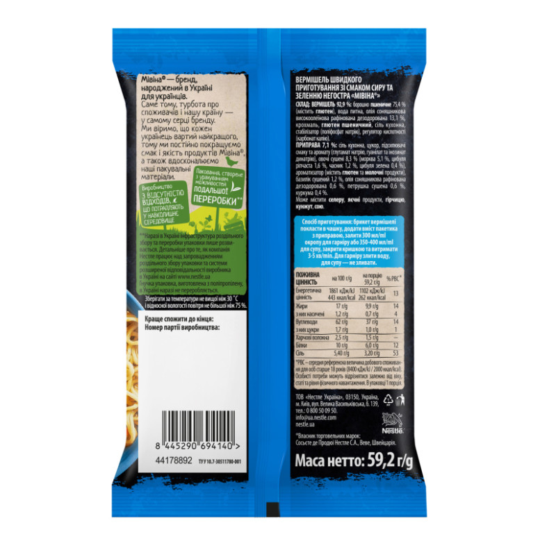 | Склад (укр.) | Вермішель 92.9%: борошно пшеничне 75.4% (містить глютен), вода питна, олія соняшникова високоолеїнова рафінована дезодорована 13.1%, крохмаль, глютен пшеничний, сіль кухонна, стабілізатор (поліфосфат натрію), регулятор кислотності (карбонат калію), приправа 7.1%: сіль кухонна, цукор, підсилювачі смаку та аромату (глутамат натрію, гуанілат та інозинат динатрію), овочі сушені 8.3% (морква 5.1%, цибуля ріпчаста 1.6%, часник 1.2%, цибуля зелена 0.4%), ароматизатор (містить глютен та молочні продукти), базилік сушений 1.2%, олія соняшникова рафінована дезодорована 0.6%, петрушка сушена 0.6%, куркума 0.4% |