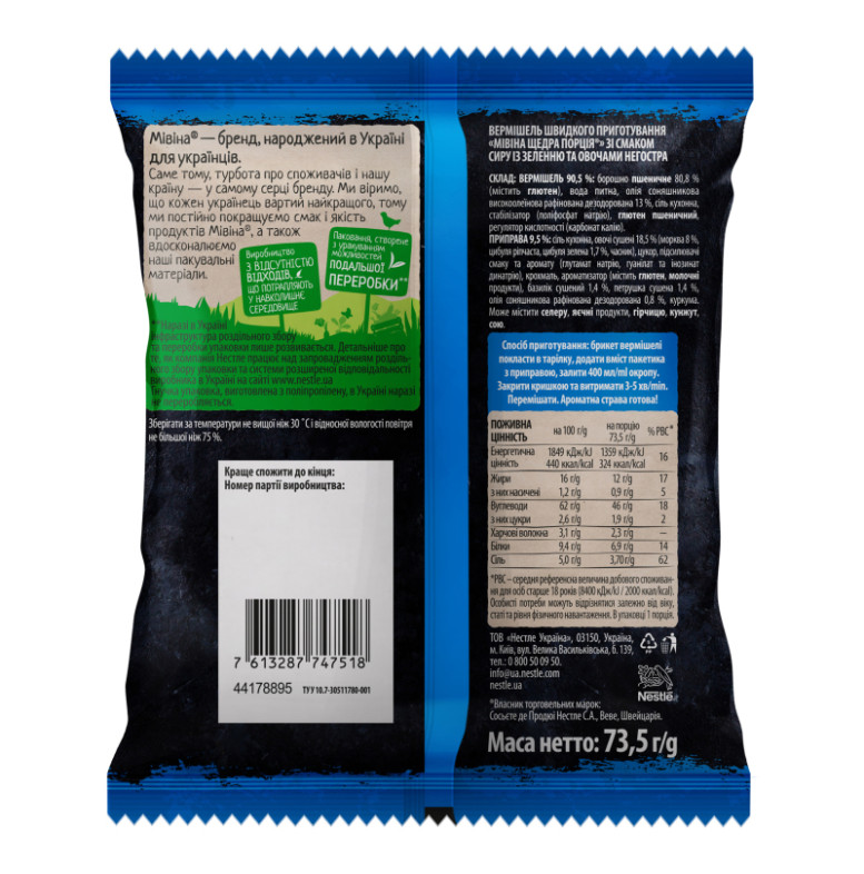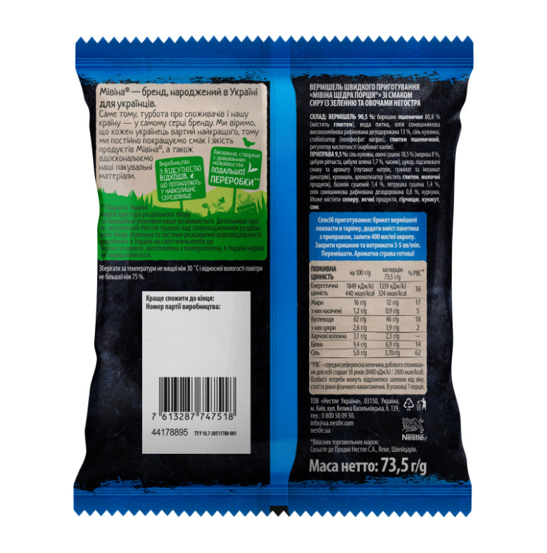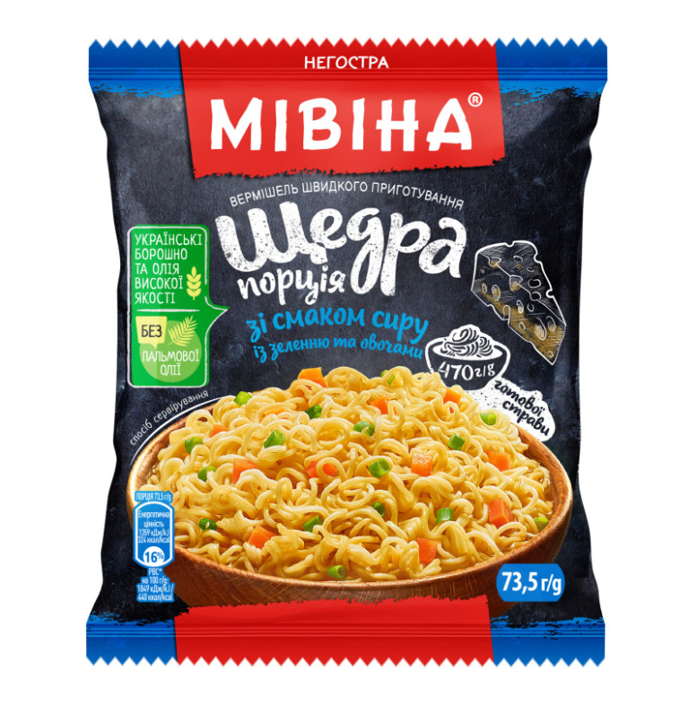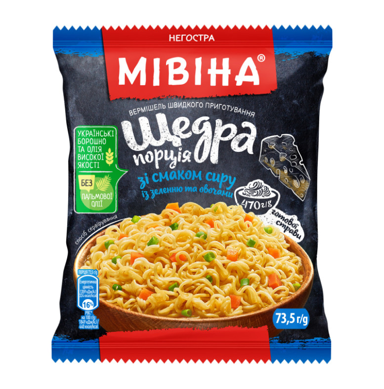 Вермішель швидкого приготування негостра зі смаком сиру із зеленню та овочами Щедра порція Мівіна м/у 73.5г