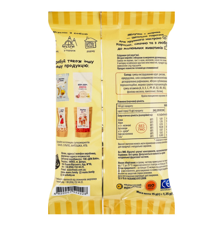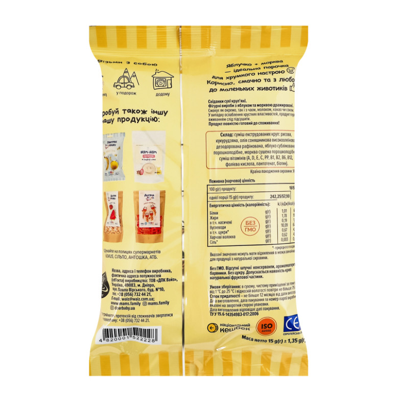 Склад: Суміш екструдованих круп: рисова, кукурудзяна, олія соняшникова високоолеїнова дезодорована рафінована, яблуко сублімоване порошкоподібне, морква сушена порошкоподібна, суміш вітамінів (A, D, E, C, PP, B1, B2, B6, В12, фолієва кислота, пантотенат, біотин