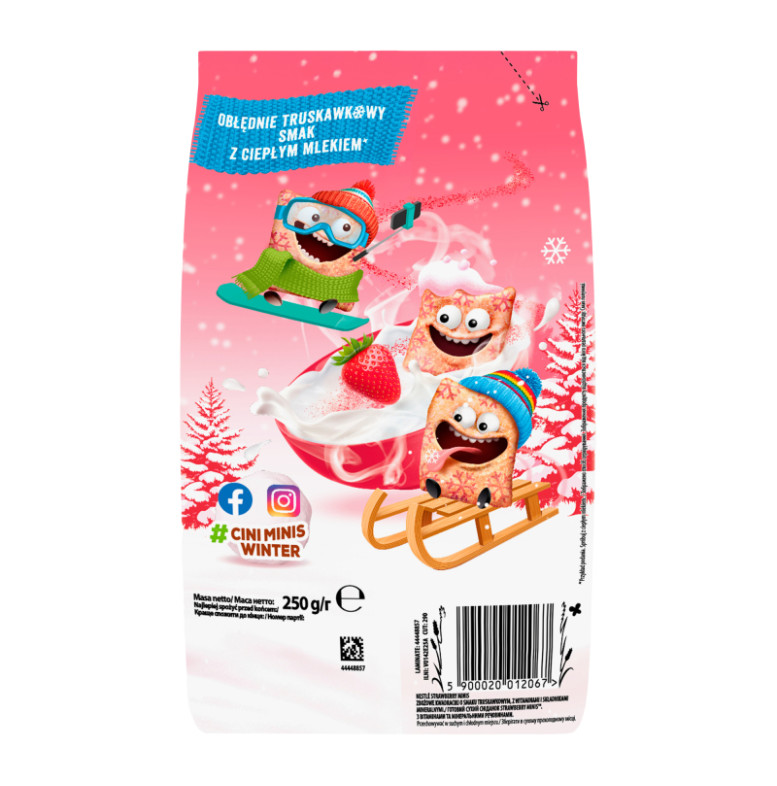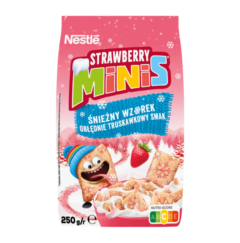 | Склад (укр.) | Борошно з цільнозернової пшениці 34.8% (містить глютен), борошно рисове 31%, цукор, олія соняшникова, глюкозний сироп, крохмаль пшеничний (містить глютен), карбонат кальцію, сіль кухонна, порошок полуниці сушеної 0.1%, мальтодекстрин, натуральний ароматизатор, емульгатор (лецитини), антиоксидант (екстракт токоферолів), барвники харчові (концентрат чорної моркви та чорної смородини, інвертний цукор), регулятор кислотності (лимонна кислота), залізо, ніацин (вітамін B3), пантотенова кислота (вітамін B5), вітамін D, вітамін B6, тіамін (вітамін B1), рибофлавін (вітамін B2), фолієва кислота (вітамін B9) |