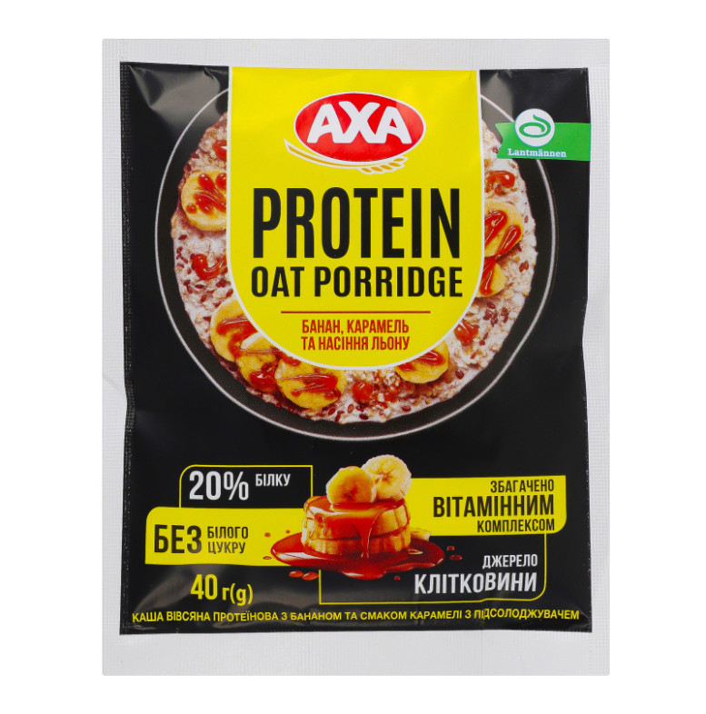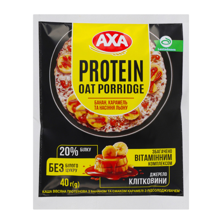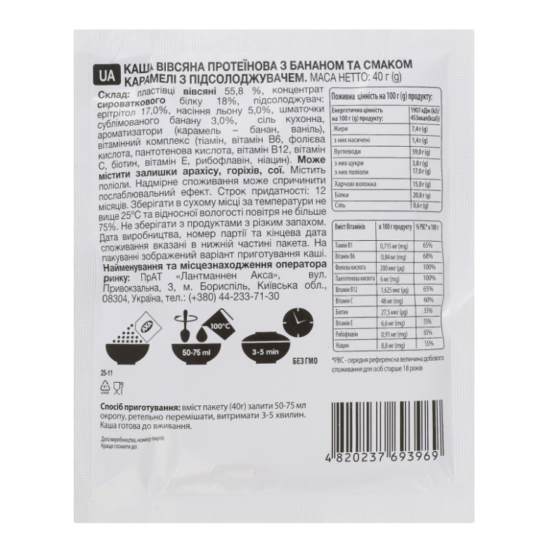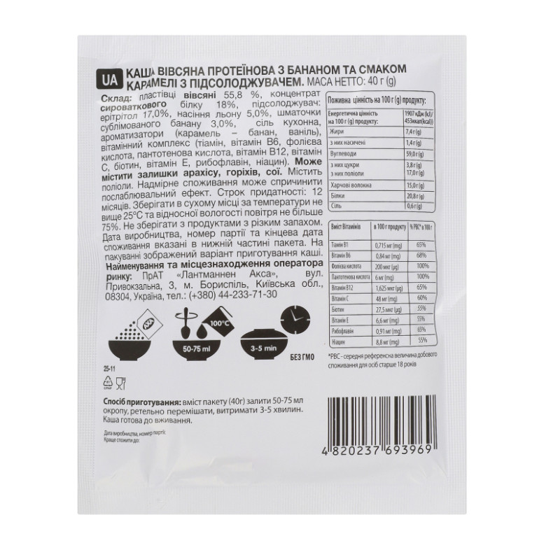 Склад: Пластівці вівсяні 55.8%, концентрат сироваткового білку 18%, підсолоджувач: ерітрітол 17%, насіння льону 5%, шматочки сублімованого банану 3%, сіль кухонна, ароматизатори (карамель-банан, ваніль), вітамінний комплекс (тіамін, вітамін В6, фолієва кислота, пантотенова кислота, вітамін В12, вітамін С, біотин, вітамін Е, рибофлавін, ніацин)
