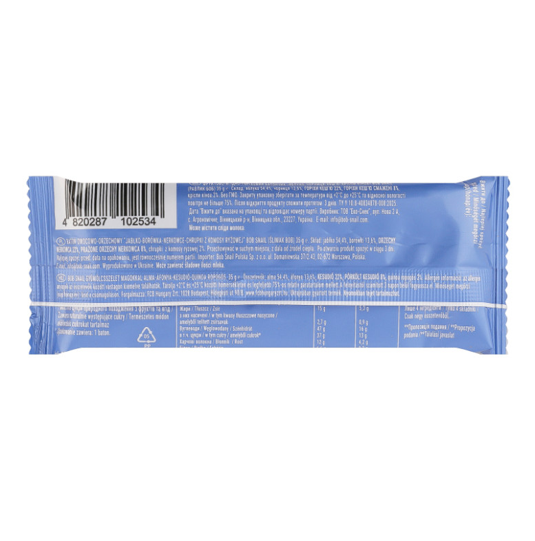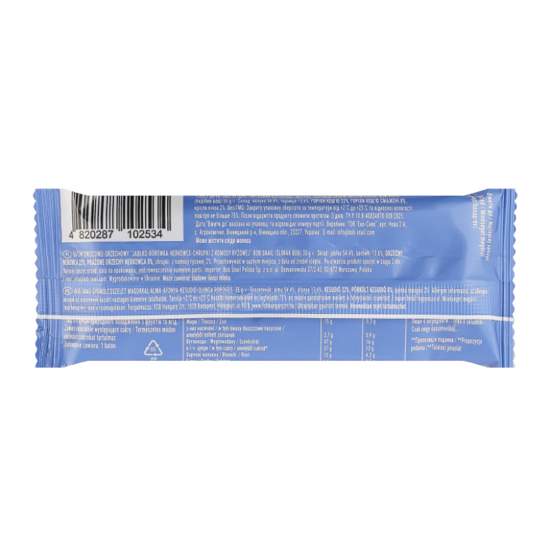 | Склад (укр.) | Яблуко 54.4%, чорниця 13.6%, горіхи кеш'ю 22%, горіхи кеш'ю смажені 8%, кріспи кіноа 2% |