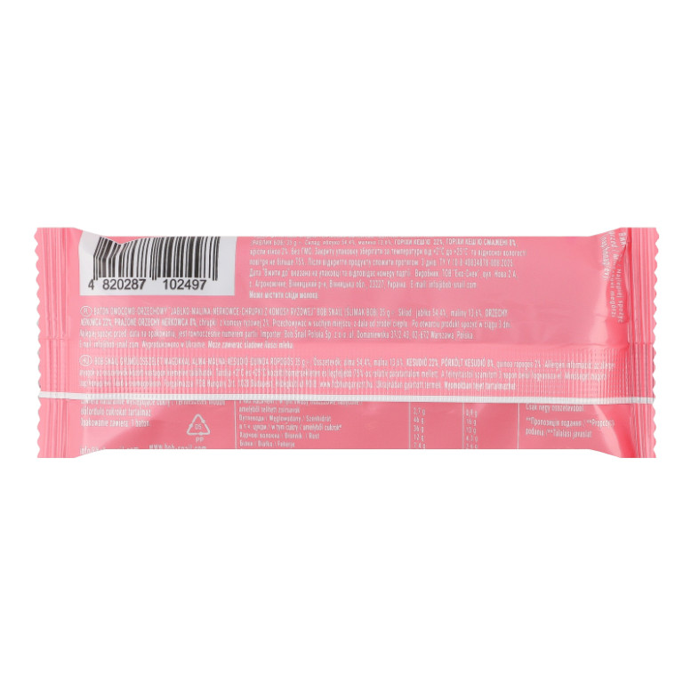 | Склад (укр.) | Яблуко 54.4%, малина 13.6%, горіхи кеш'ю 22%, горіхи кеш'ю смажені 8%, кріспи кіноа 2% |