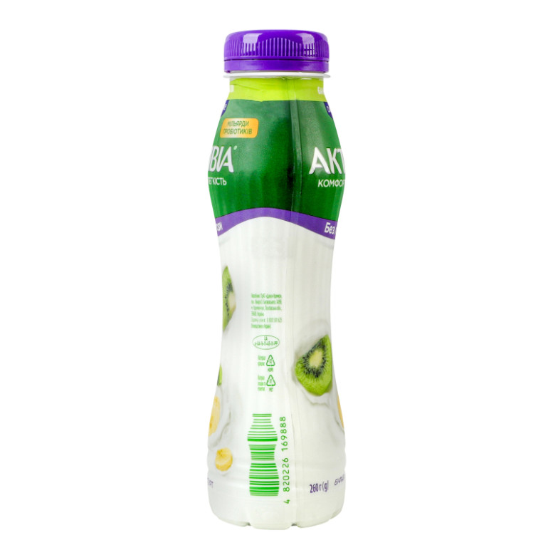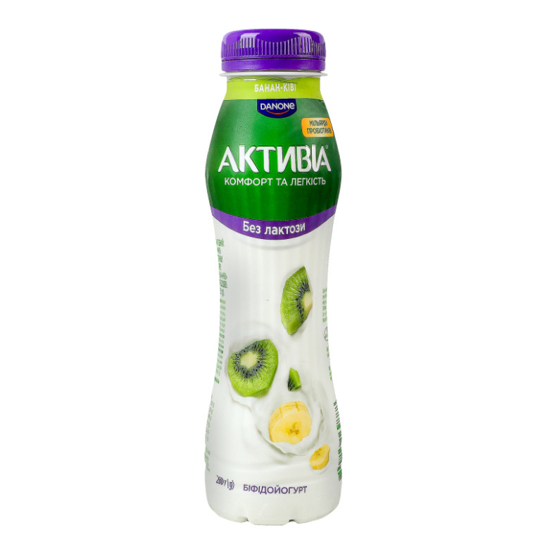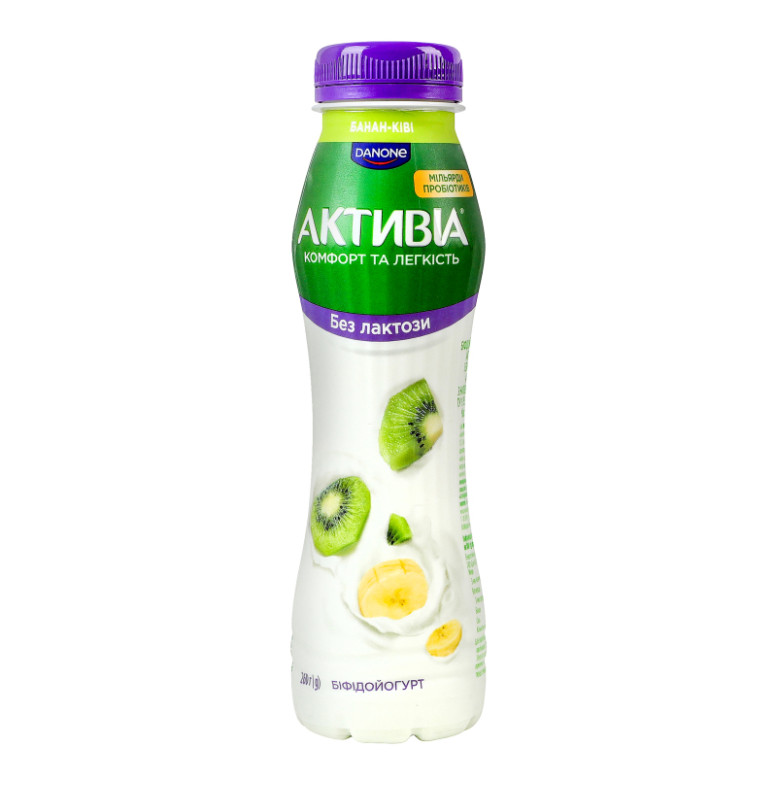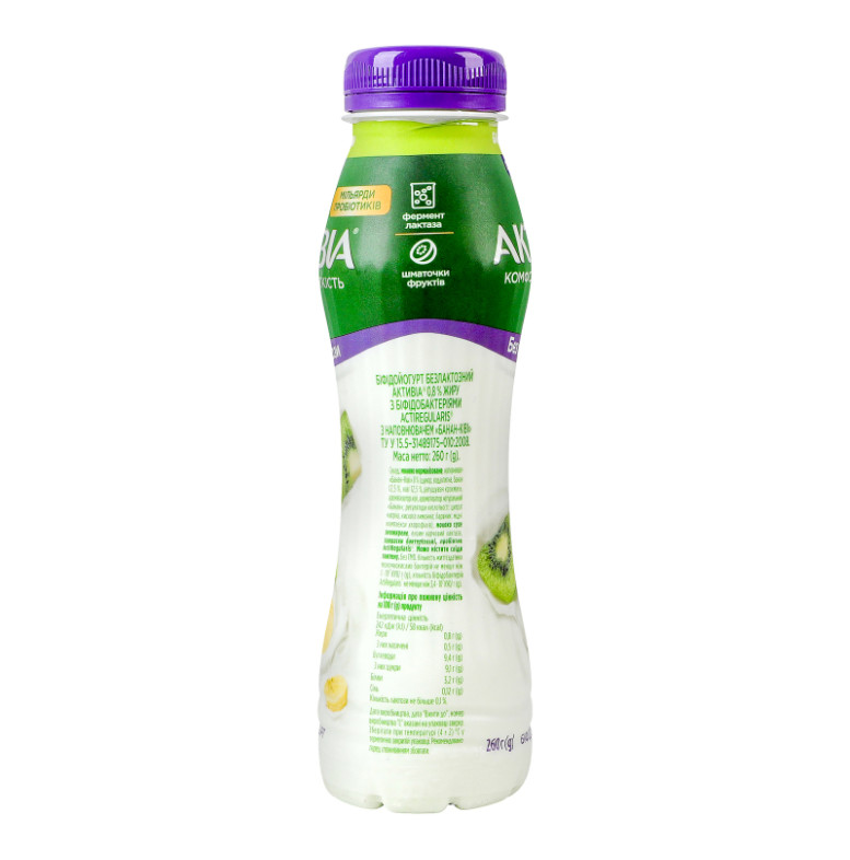 | Склад (укр.) | Молоко нормалізоване, наповнювач "Банан-ківі" 8% (цукор, вода питна, банан 12.5%, ківі 12.5%, загущувач крохмаль, ароматизатор ківі, ароматизатор натуральний "Банан", регулятори кислотності: цитрат натрію, кислота лимонна, барвник мідні комплекси хлорофілів), молоко сухе знежирене, ензим харчовий лактаза, закваски бактеріальні, пробіотик ActiRegularis |