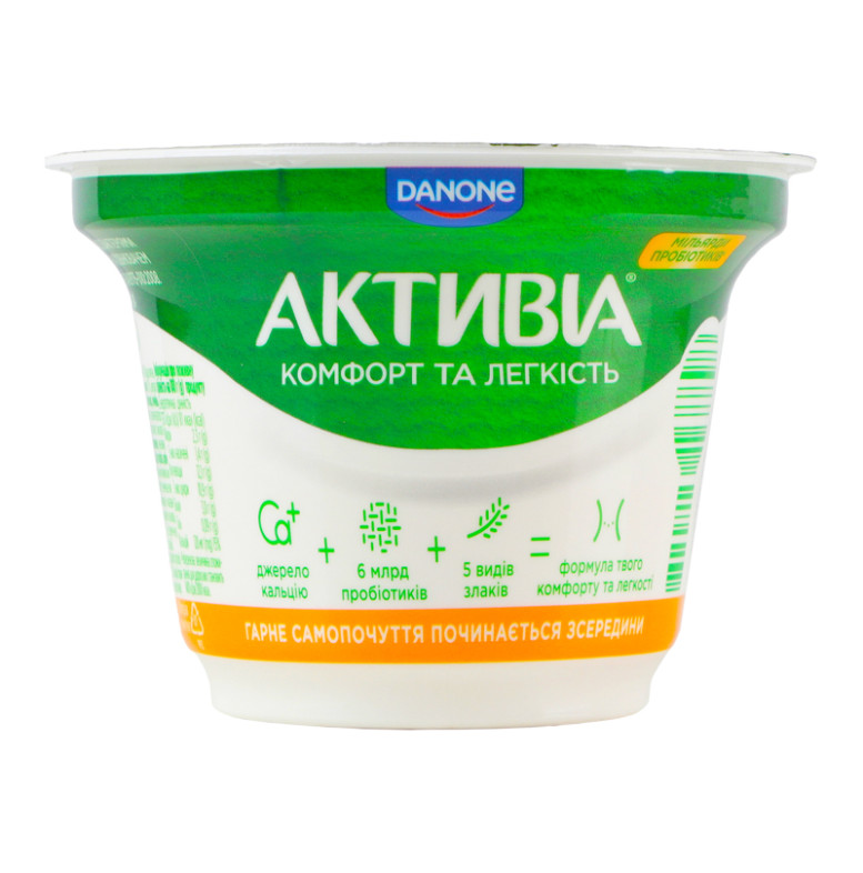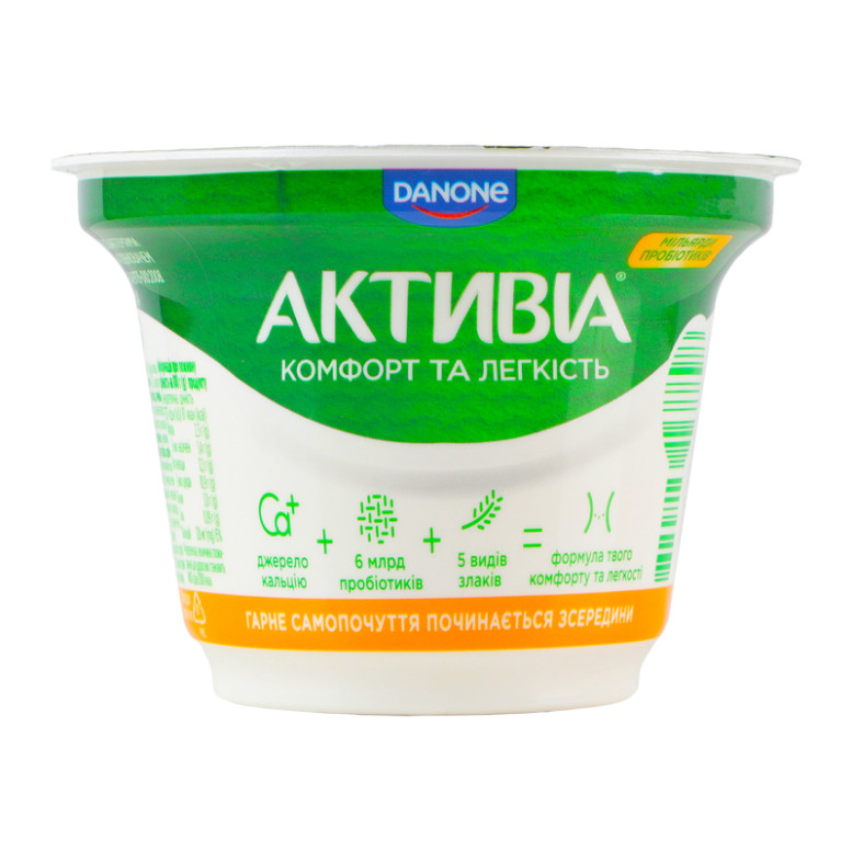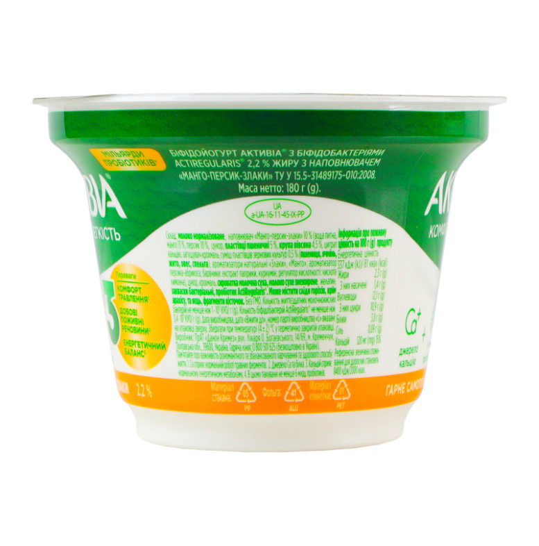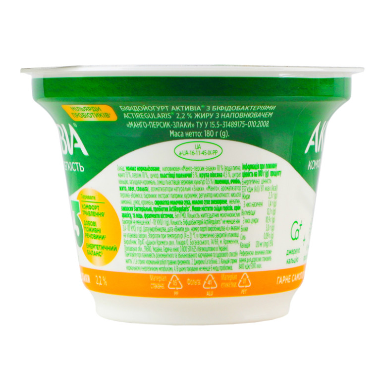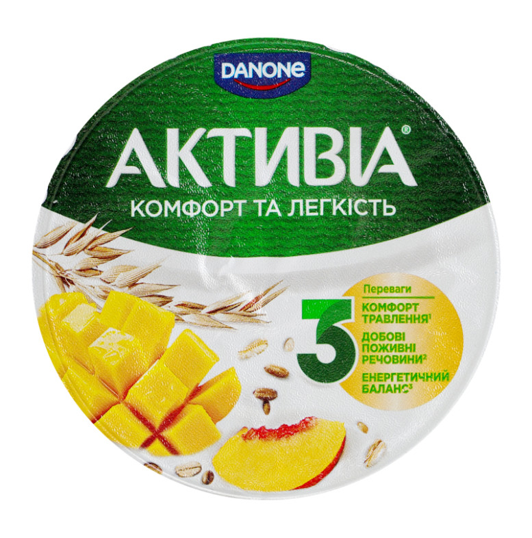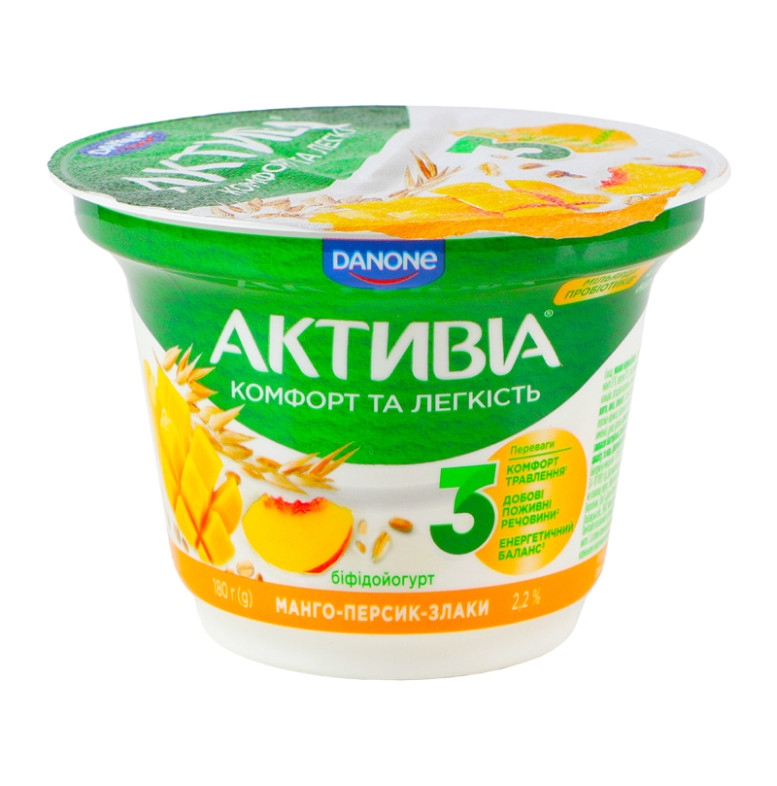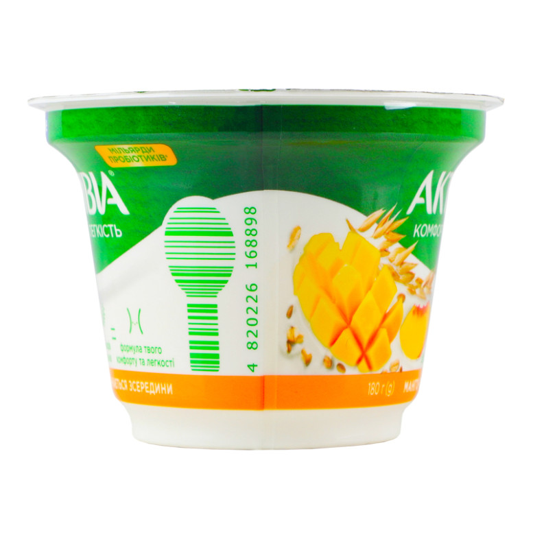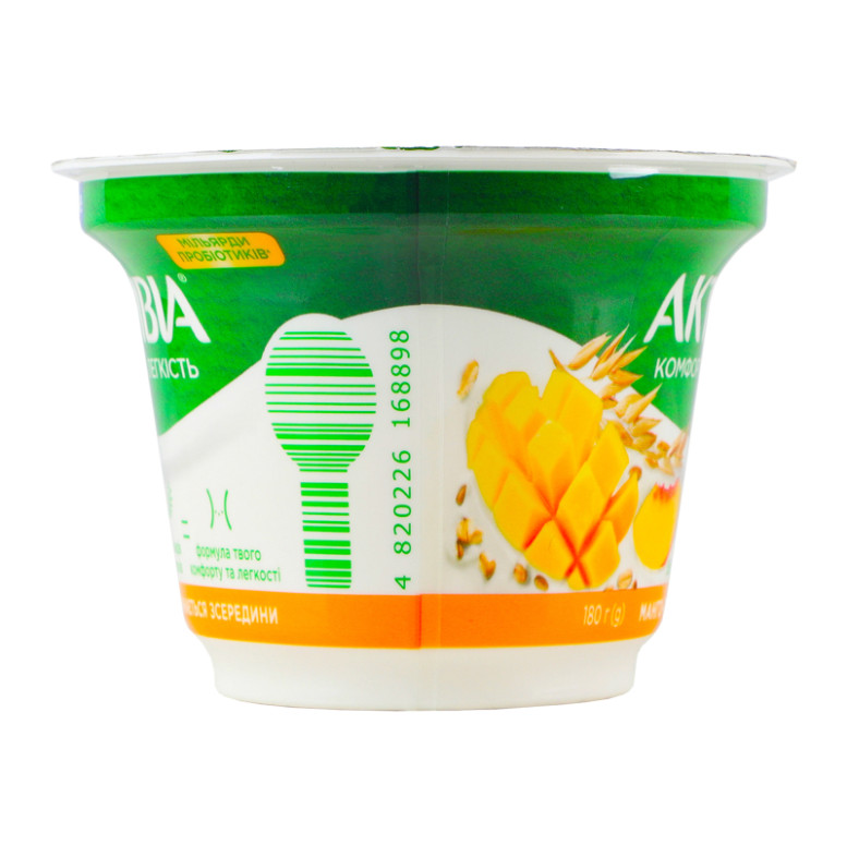 | Склад (укр.) | Молоко нормалізоване, наповнювач "Манго-персик-злаки" 10% (вода питна, манго 13%, персик 10%, цукор, пластівці пшеничні 5 %, крупа вівсяна 4.5%, цитрат кальцію, загущувач крохмаль, суміш пластівців зернових культур 0.5% (пшениця, ячмінь, жито, овес, спельта), ароматизатори натуральні: "Злаки", "Манго"; ароматизатор персика-абрикоса; барвники: екстракт паприки, куркумін; регулятор кислотності: кислота лимонна), цукор, крохмаль, сироватка молочна суха, молоко сухе знежирене, желатин, закваски бактеріальні, пробіотик ActiRegularis |