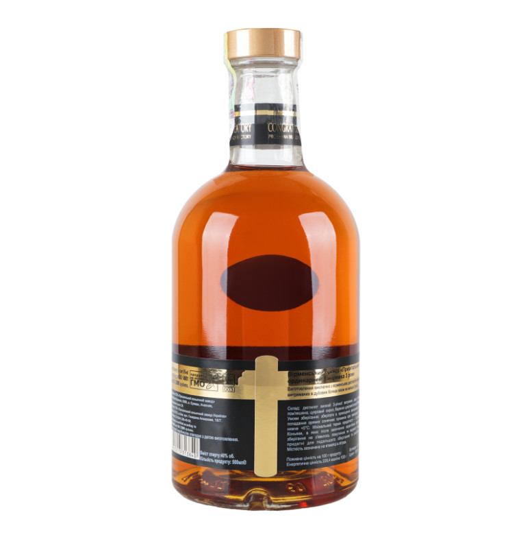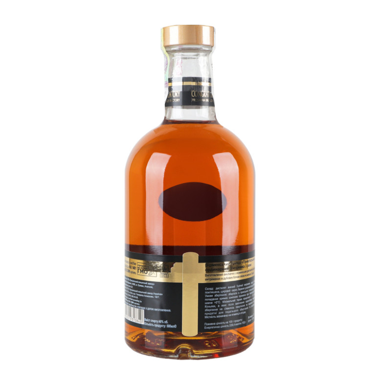 | Склад (укр.) | Дистилят винний 3-річної витримки, вода питна пом'якшена, цукровий сироп, барвник цукровий колер Е150А |
