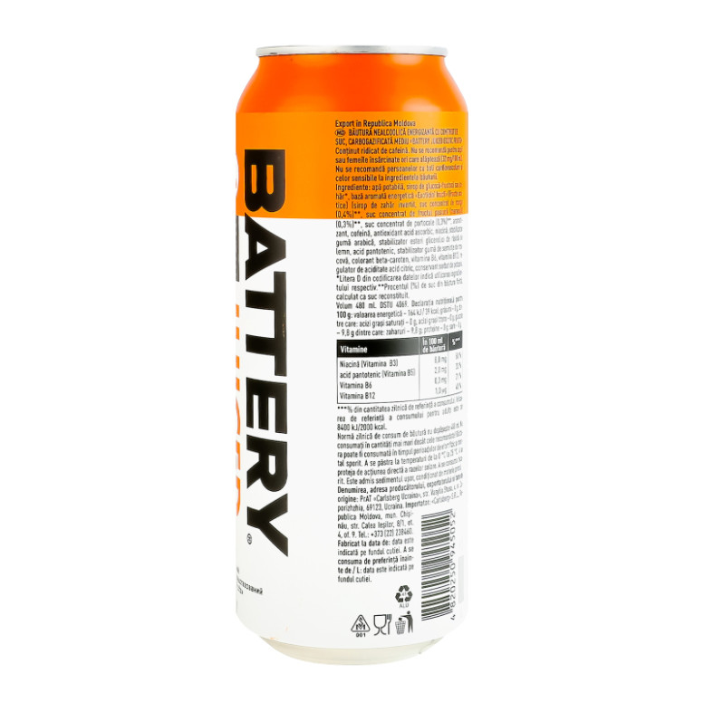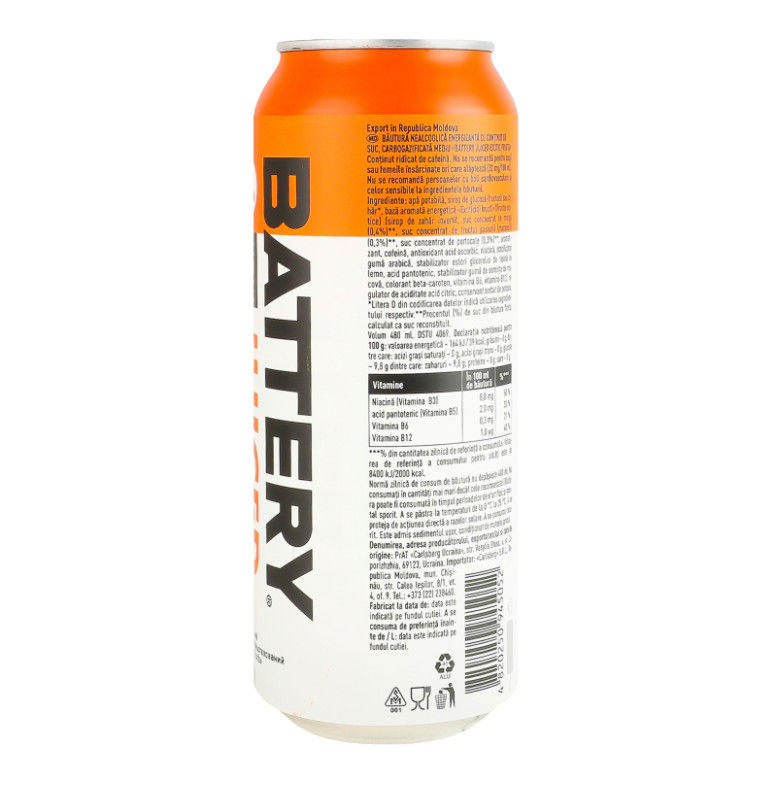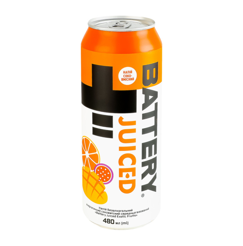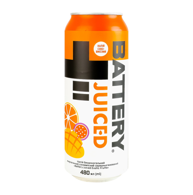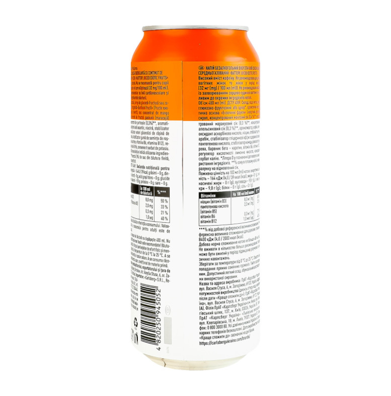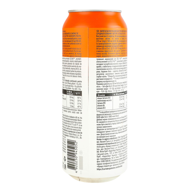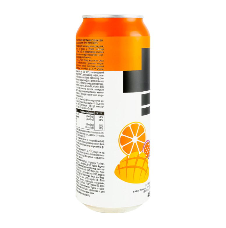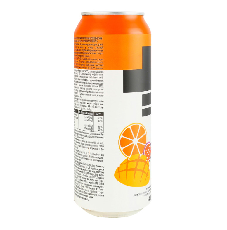 Склад: Вода питна, сироп глюкозно-фруктозний або цукор, ароматична енергетична основа "Екзотичні фрукти" (інвертний цукровий сироп, концентрований манговий сік (0.4%), концентрований маракуєвий сік (0.3%), концентрований апельсиновий сік (0.3%), ароматизатор, кофеїн, антиоксидант аскорбінова кислота, ніацин, стабілізатор гуміарабік, стабілізатор гліцеринові ефіри з деревної смоли, пантотенова кислота, стабілізатор камедь ріжкового дерева, барвник бета-каротин, вітамін В6, вітамін В12), регулятор кислотності лимонна кислота, консервант сорбат калію