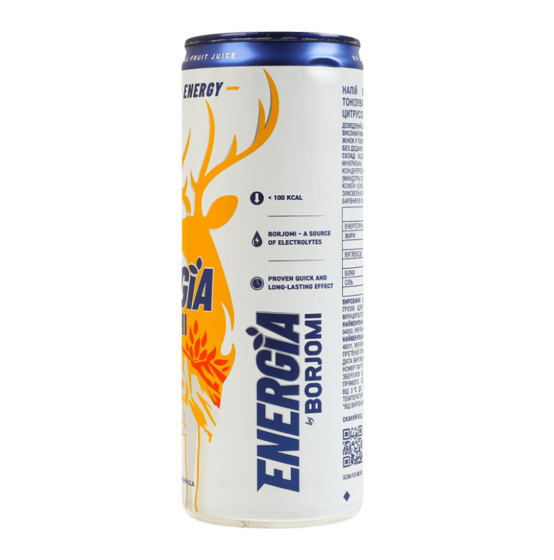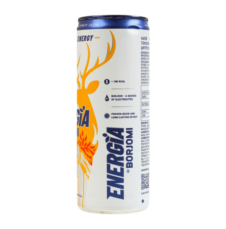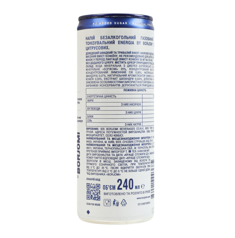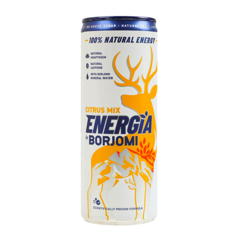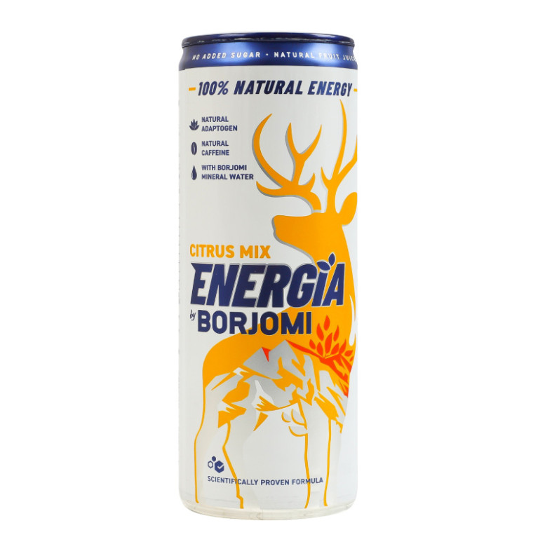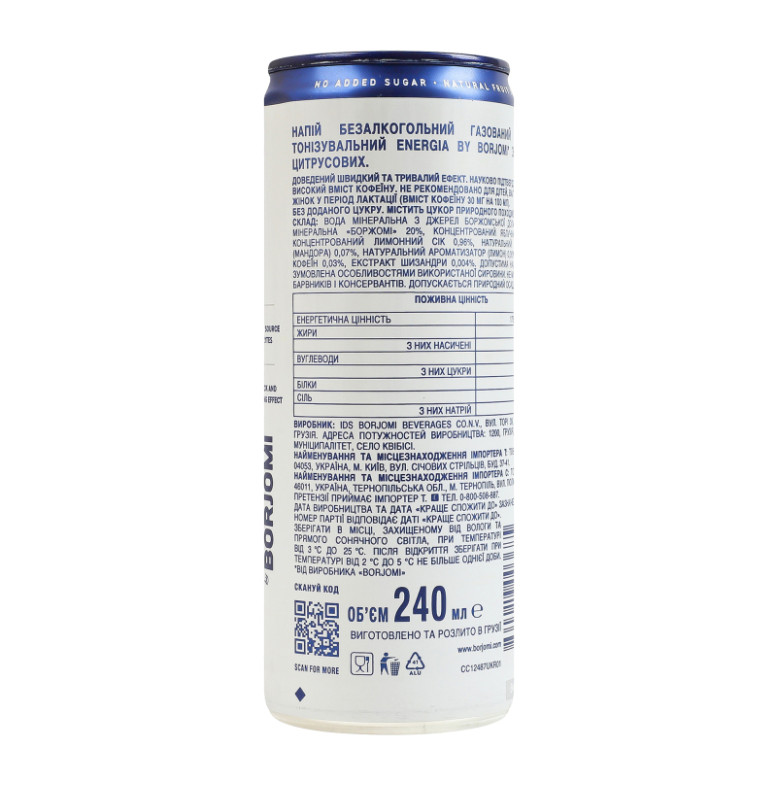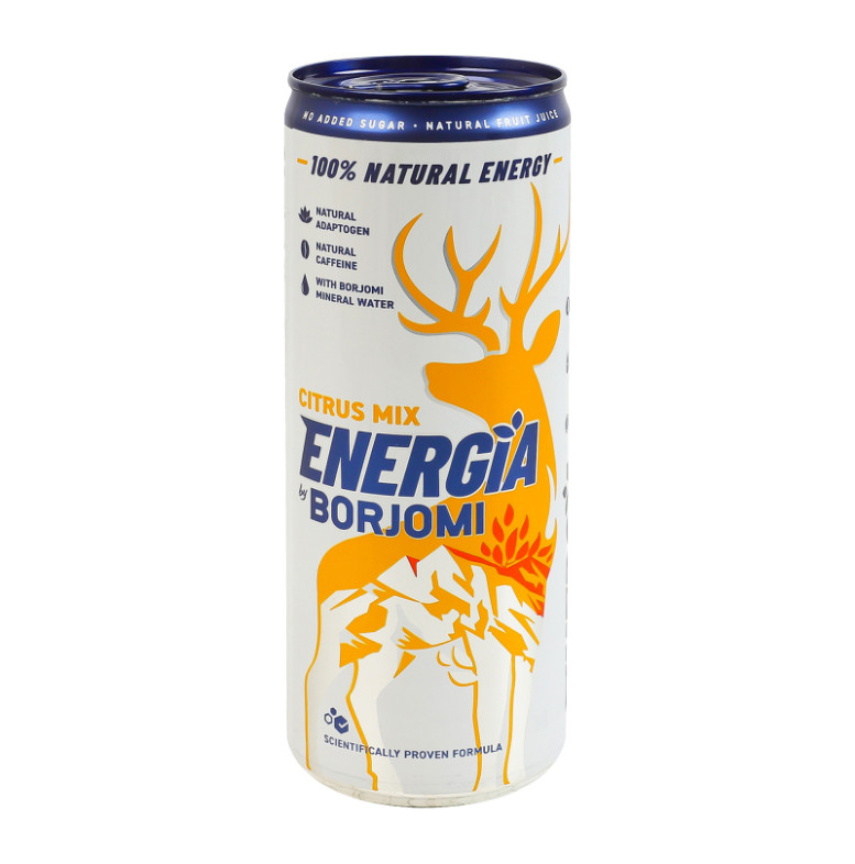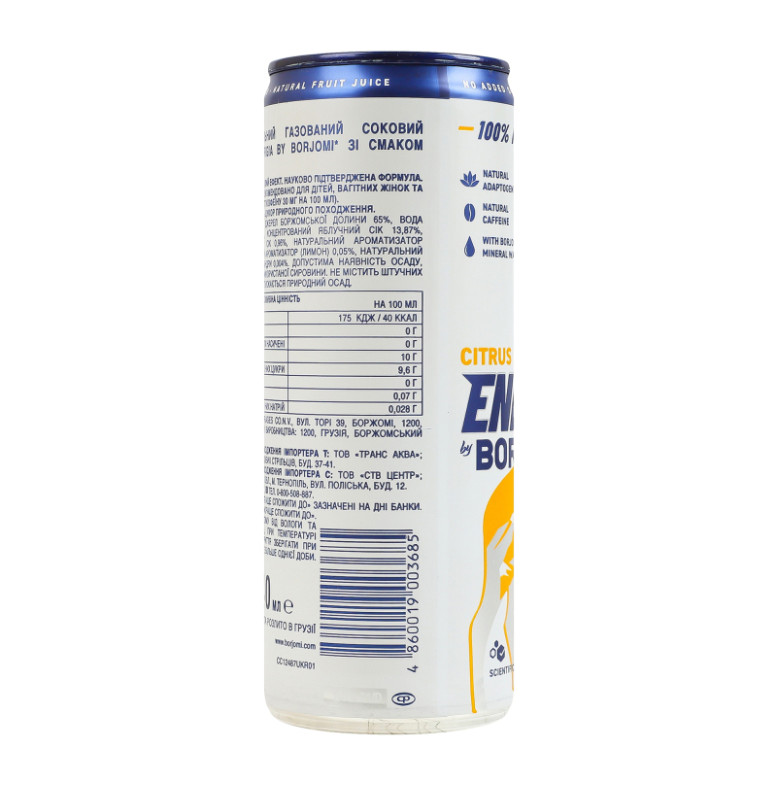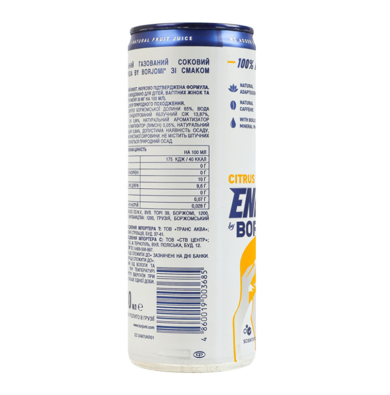 Склад: Вода мінеральна з джерел боржомської боржомської долини 65%, вода мінеральна "Боржомі" 20%, концентрований яблучний сік 13.87%, концентрований лимонний сік 0.96%, натуральний ароматизатор (мандора) 0.07%, натуральний ароматизатор (лимон) 0.05%, натуральний кофеїн 0.03%, екстракт шизандри 0.004%