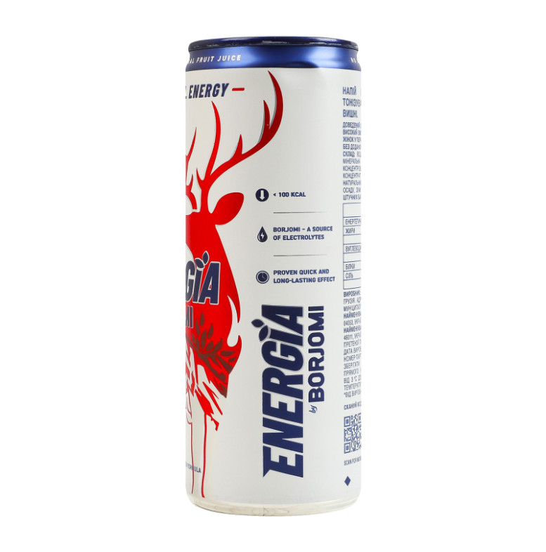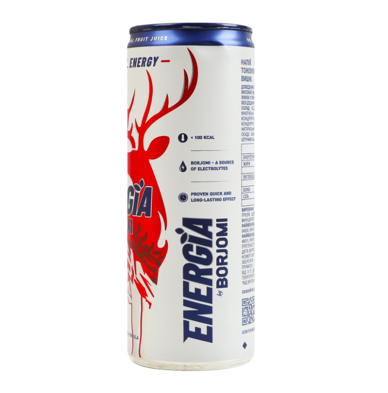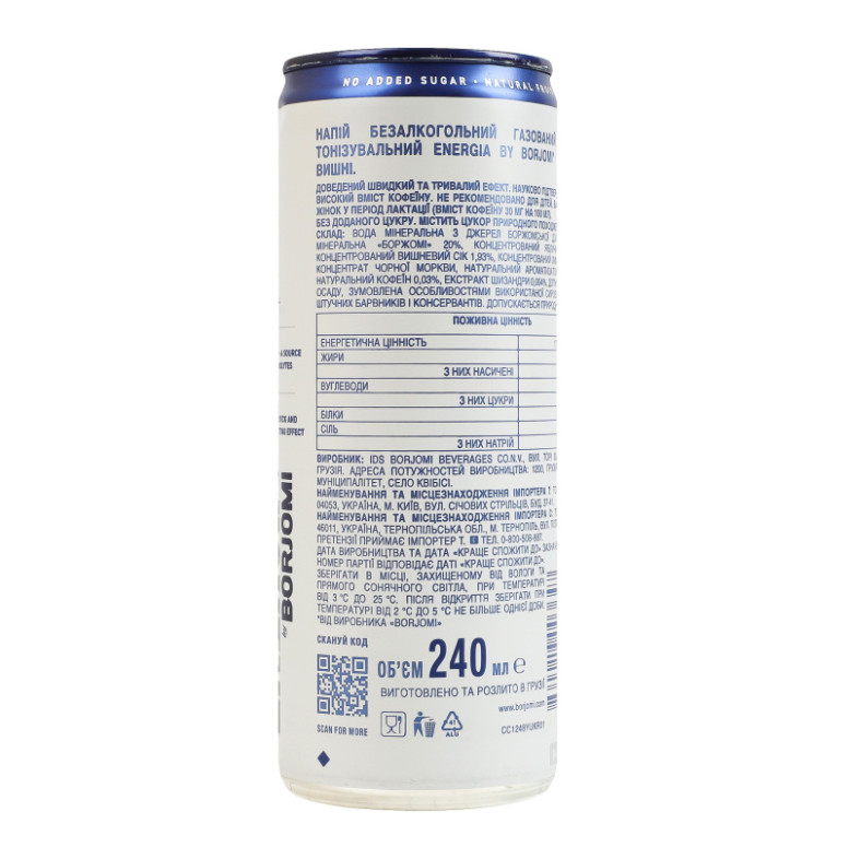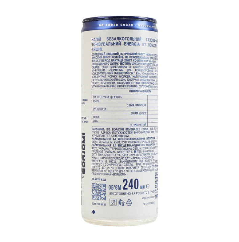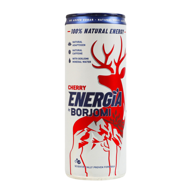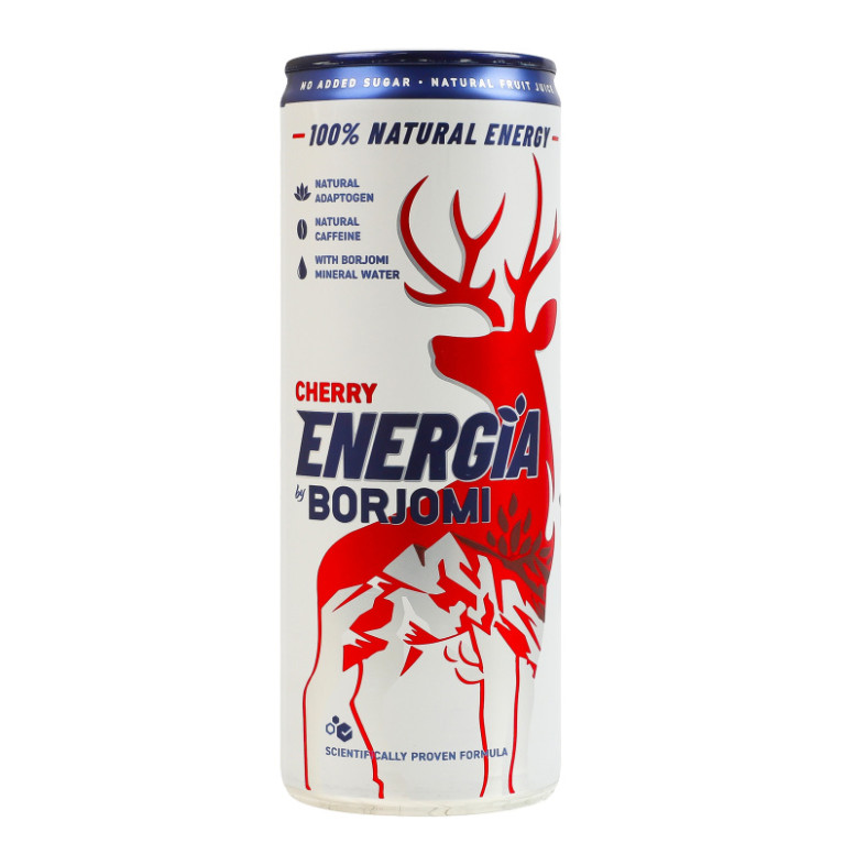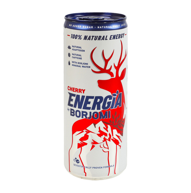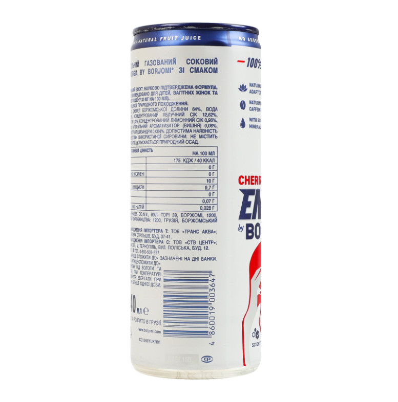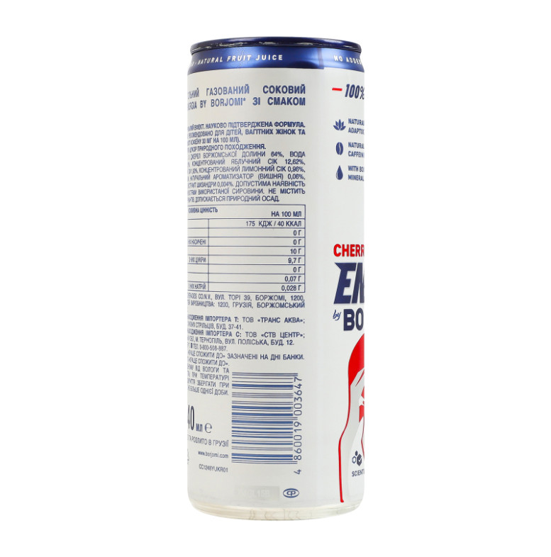 Склад: Вода мінеральна з джерел боржомської долини 64%, вода мінеральна "Боржомі" 20%, концентрований яблучний сік 12.62%, концентрований вишневий сік 1.93%, концентрований лимонний сік 0.96%, концентрат чорної моркви, натуральний ароматизатор (вишня) 0.06%, натуральний кофеїн 0.03%, екстракт шизандри 0.004%