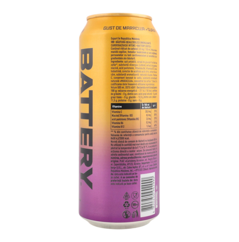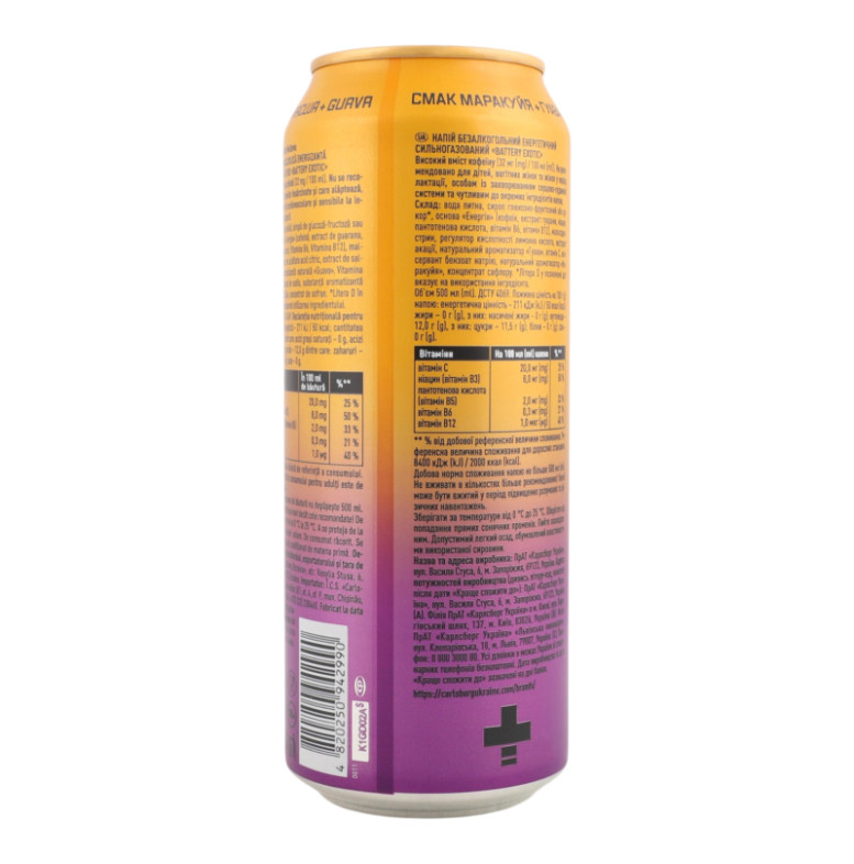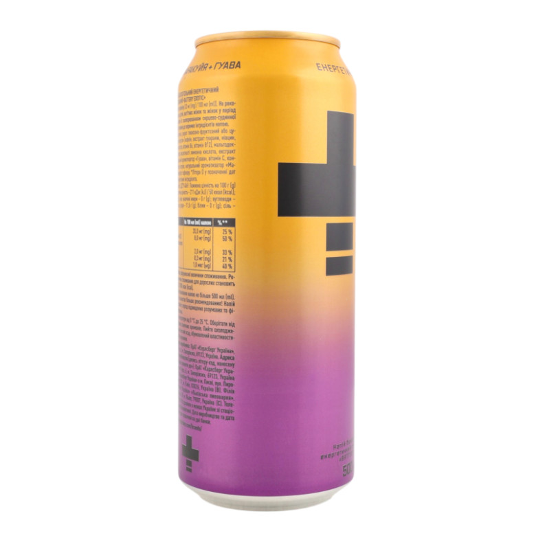 Склад: Вода питна, сироп глюкозно-фруктозний або цукор, основа "Енергія" (кофеїн, екстракт гуарани, ніацин, пантотенова кислота, вітамін В6, вітамін В12), мальтодекстрин, регулятор кислотності лимонна кислота, екстракт акації, натуральний ароматизатор "Гуава", вітамін С, консервант бензоат натрію, натуральний ароматизатор "Маракуйя", концентрат сафлору