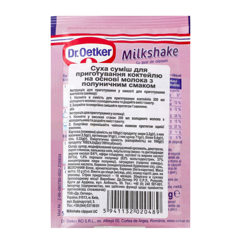 Суміш для приготування коктейлю суха на основі молока з полуничним смаком Milkshake Dr.Oetker м/у 33г