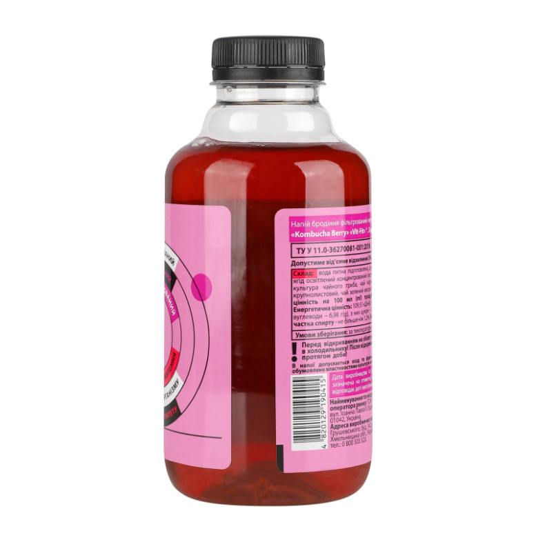 Склад: Вода питна підготовлена, цукор, сік з лісових ягід освітлений концентрований пастеризований (2%), культура чайного гриба, чай чорний цейлонський крупнолистовий, чай зелений високогірний
