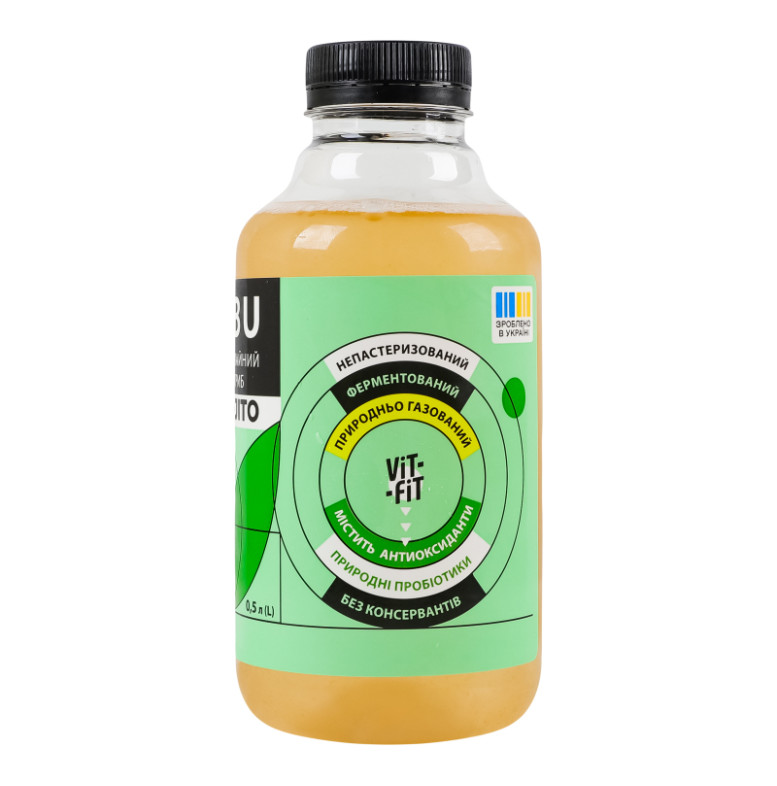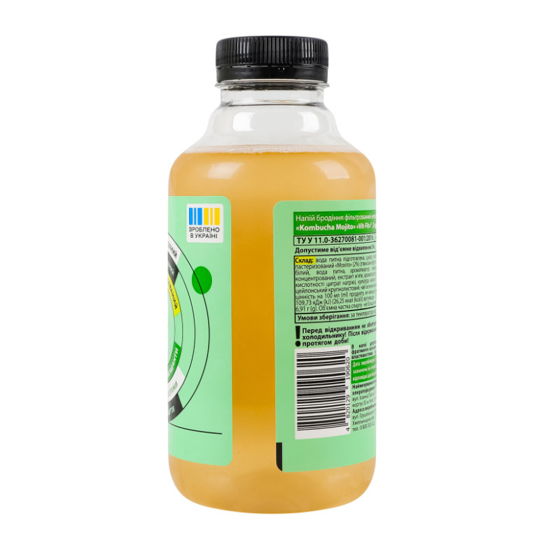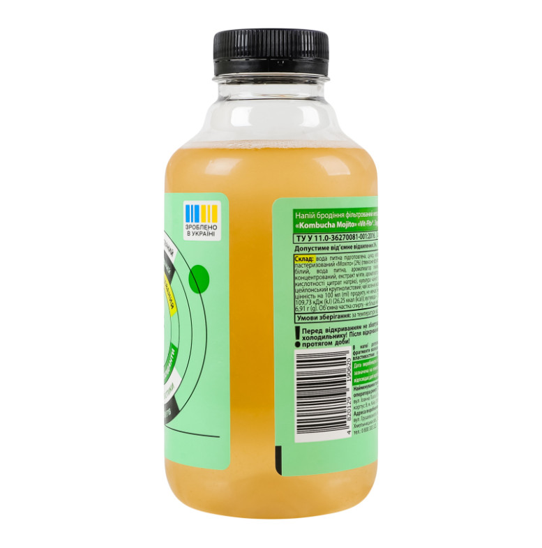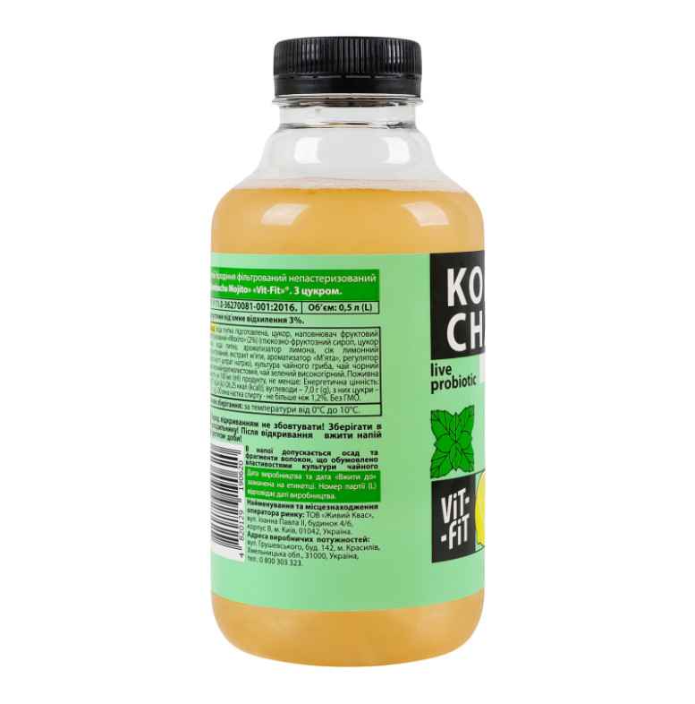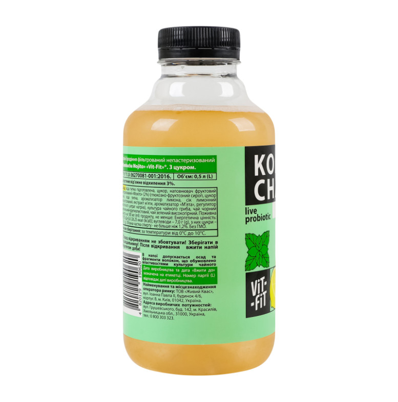 Склад: Вода питна підготовлена, цукор, наповнювач фруктовий пастеризований "Мохіто" (2%) (глюкозно-фруктозний сироп, цукор білий, вода питна, ароматизатор лимона, сік лимонний концентрований, екстракт м'яти, ароматизатор "М'ята", регулятор кислотності цитрат натрію), культура чайного гриба, чай чорний цейлонський крупнолистовий, чай зелений високогірний