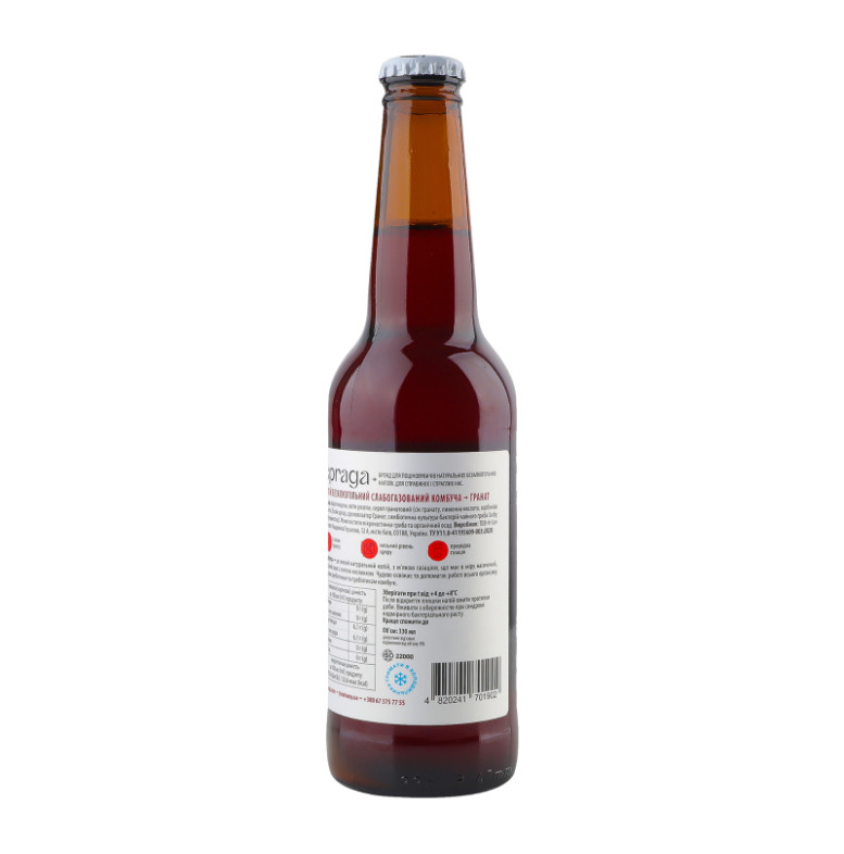 | Склад (укр.) | Вода очищена, квіти розели, сироп гранатовий (сік гранату, лимонна кислота, сорбінова кислота), білий цукор, ароматизатор Гранат, симбіотична культура бактерій чайного гриба SCOBY для ферментації |