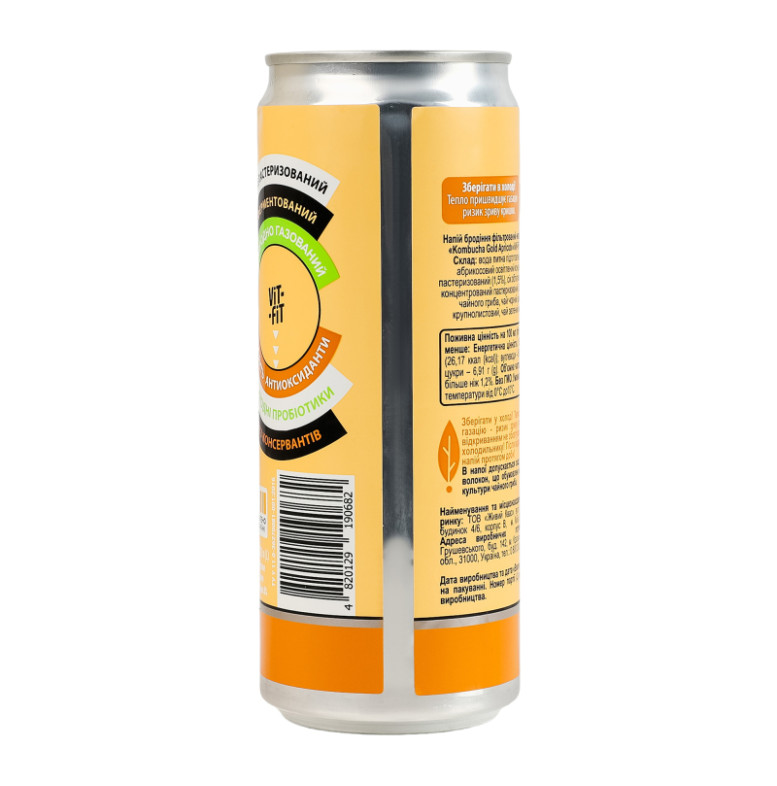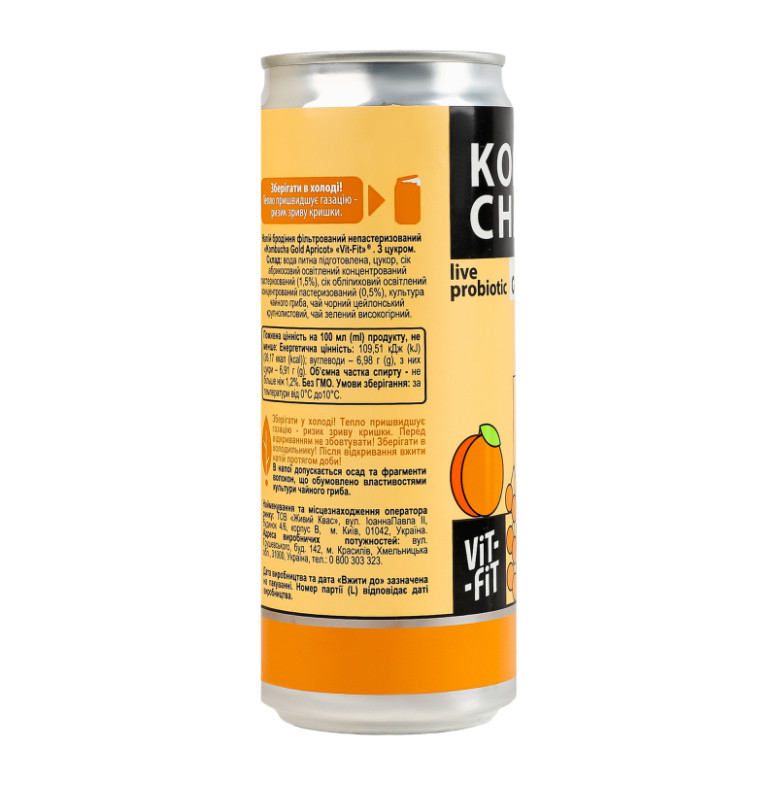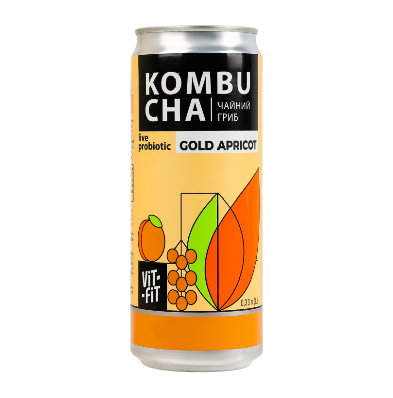 Напій бродіння фільтрований непастеризований з цукром Gold apricot Kombucha Vit-Fit з/б 0.33л