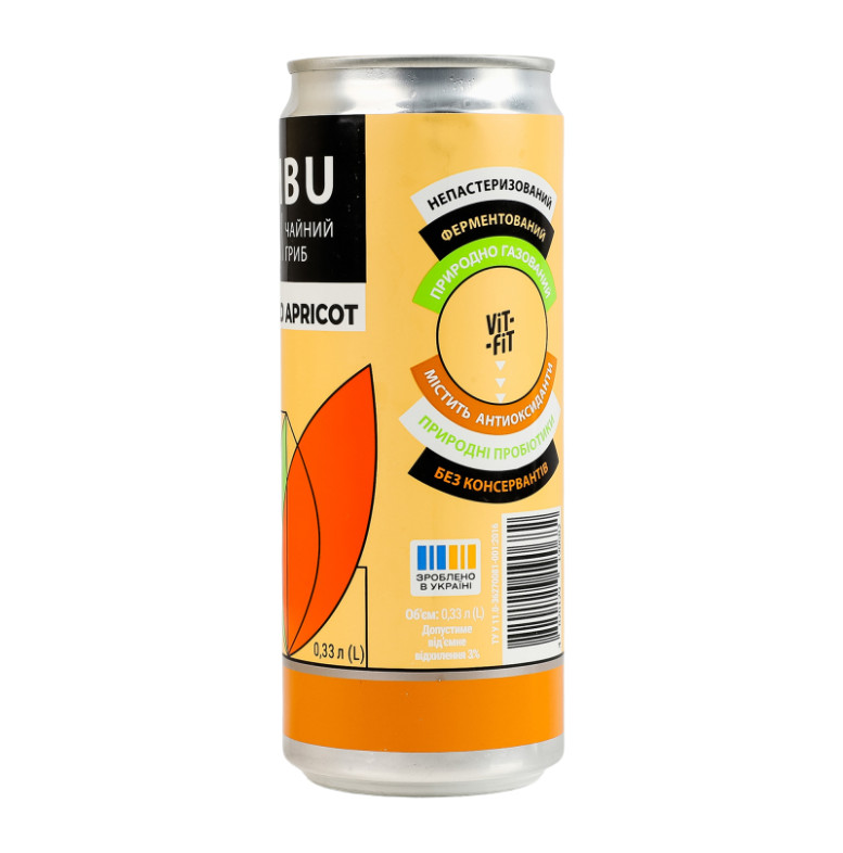 Склад: Вода питна підготовлена, цукор, сік абрикосовий освітлений концентрований пастеризований (1.5%), сік обліпиховий освітлений концентрований пастеризований (0.5%), культура чайного гриба, чай чорний цейлонський крупнолистовий, чай зелений високогірний