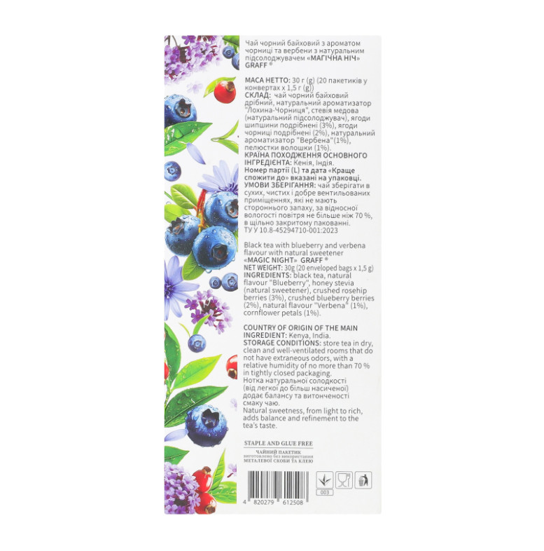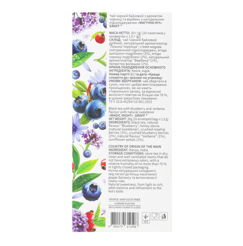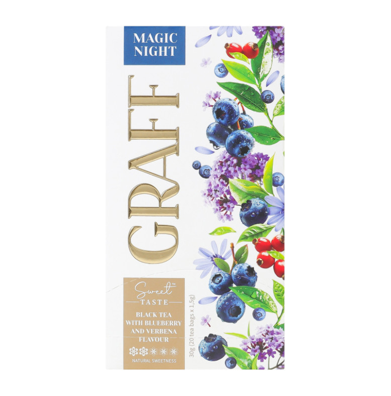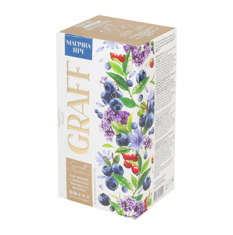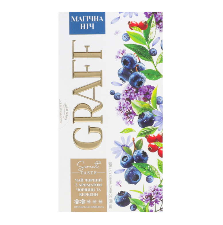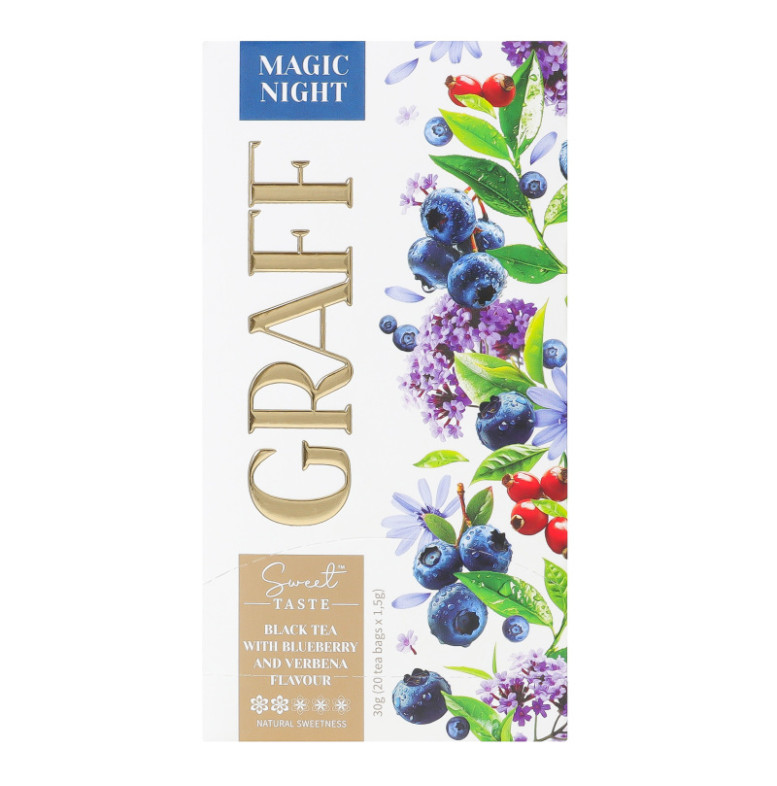 Чай чорний байховий з ароматом чорниці та вербени з натуральним підсолоджувачем Магічна ніч Graff к/у 20х1.5г