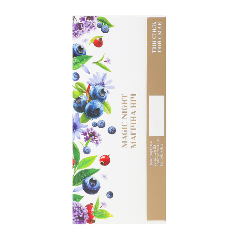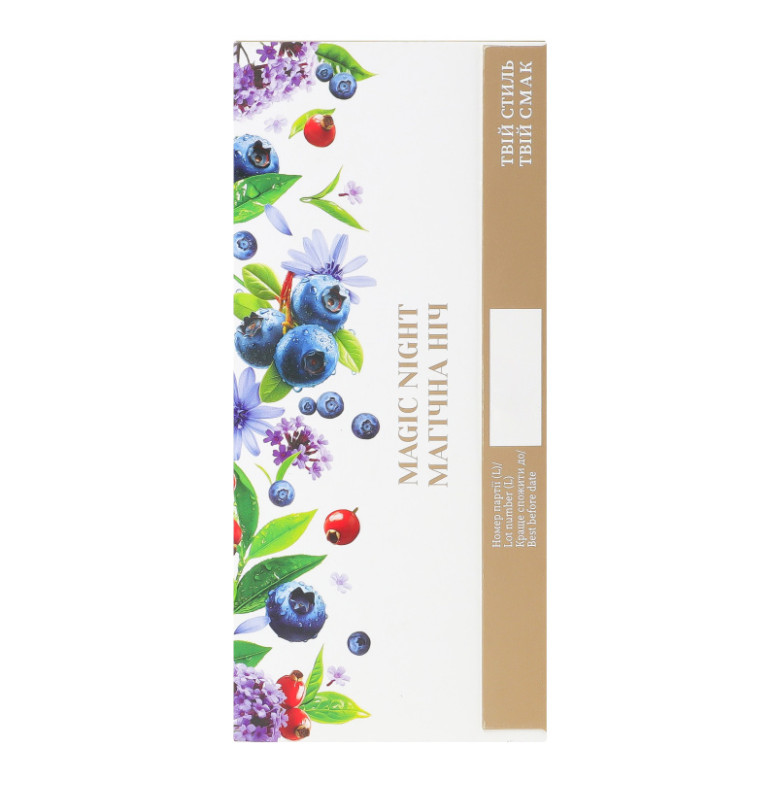 | Склад (укр.) | Чай чорний байховий дрібний, натуральний ароматизатор "Лохина-чорниця", стевія медова (натуральний підсолоджувач), ягоди шипшини подрібнені (3%), ягоди чорниці подрібнені (2%), натуральний ароматизатор "Вербена"(1%), пелюстки волошки (1%) |