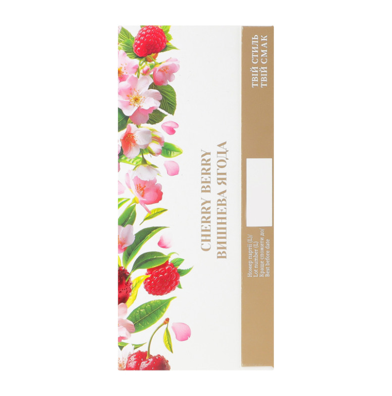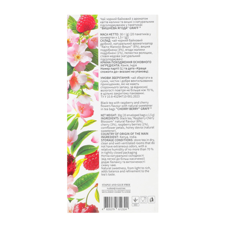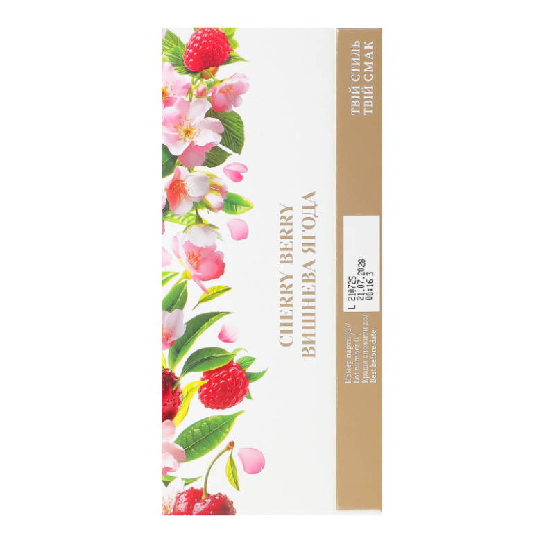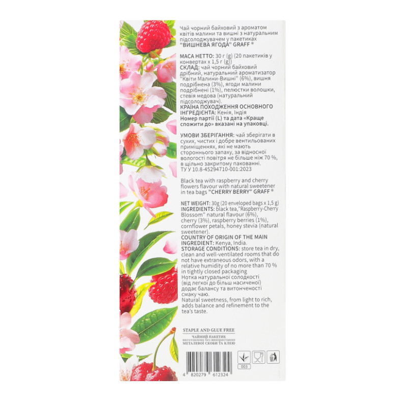 | Склад (укр.) | Чай чорний байховий дрібний, натуральний ароматизатор "Квіти малини-вишні" (6%), вишня подрібнена (3%), ягоди малини подрібнені (1%), пелюстки волошки, стевія медова (натуральний підсолоджувач) |